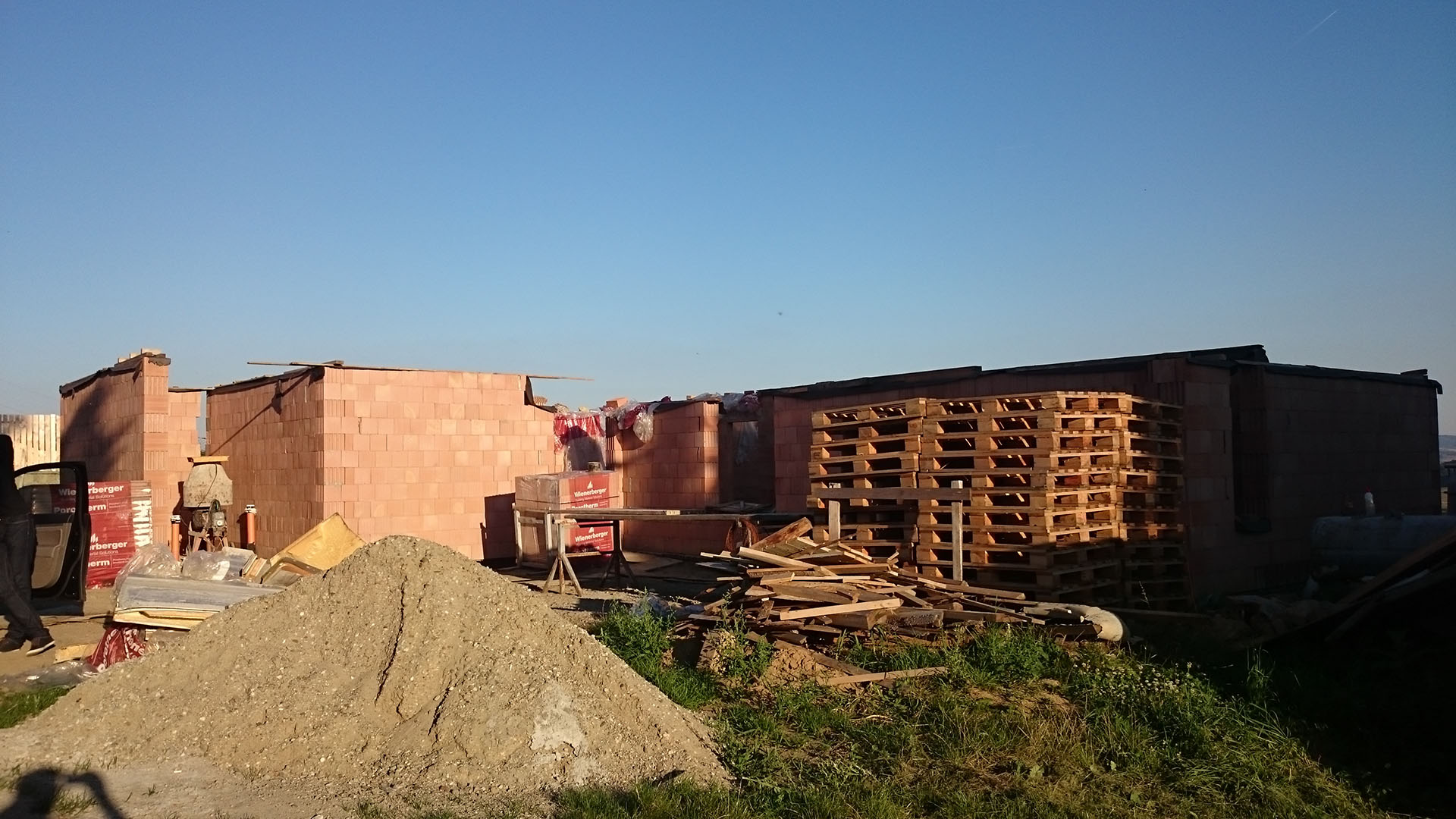 probíhá zdění obvodových stěn a vnitřních příček z cihel Porotherm.