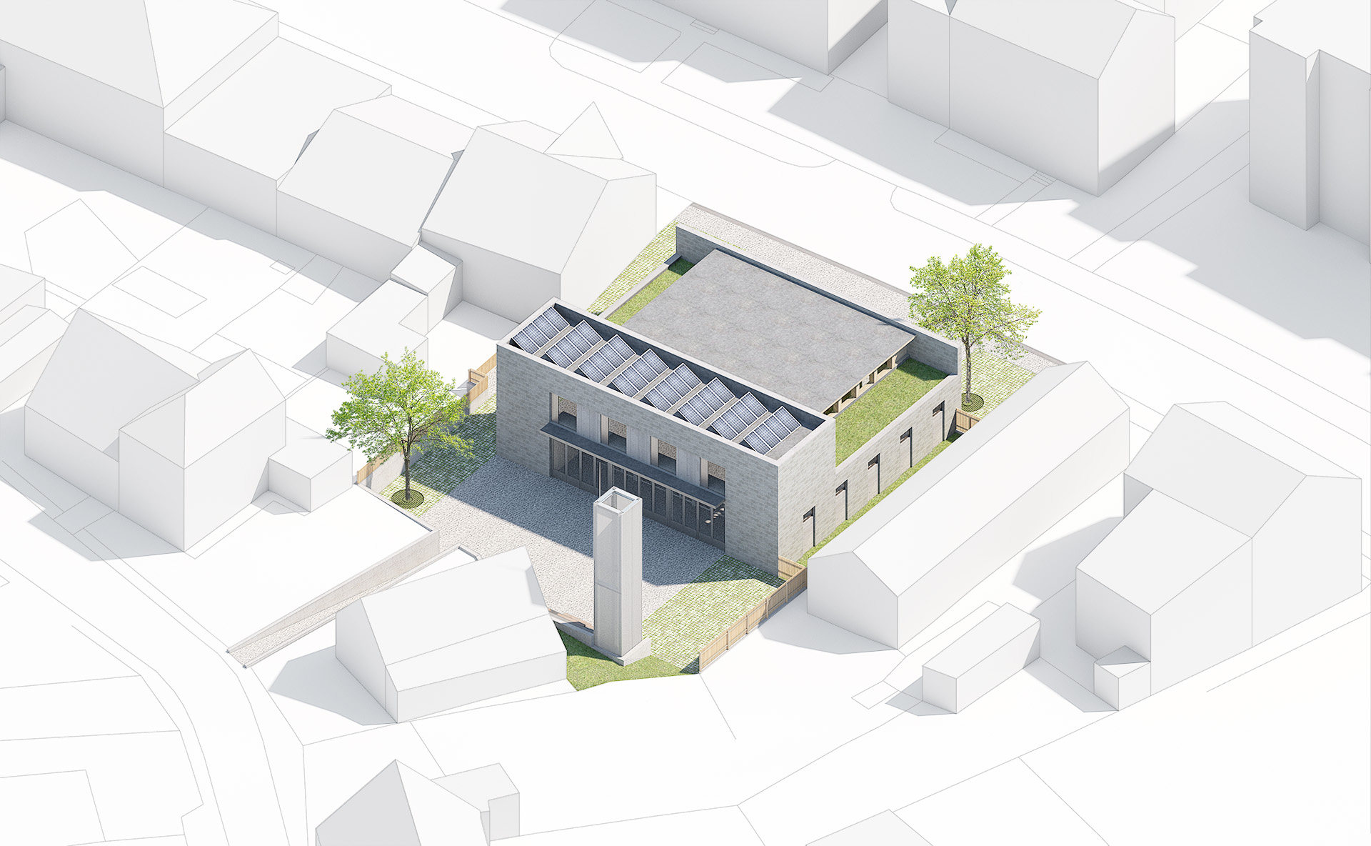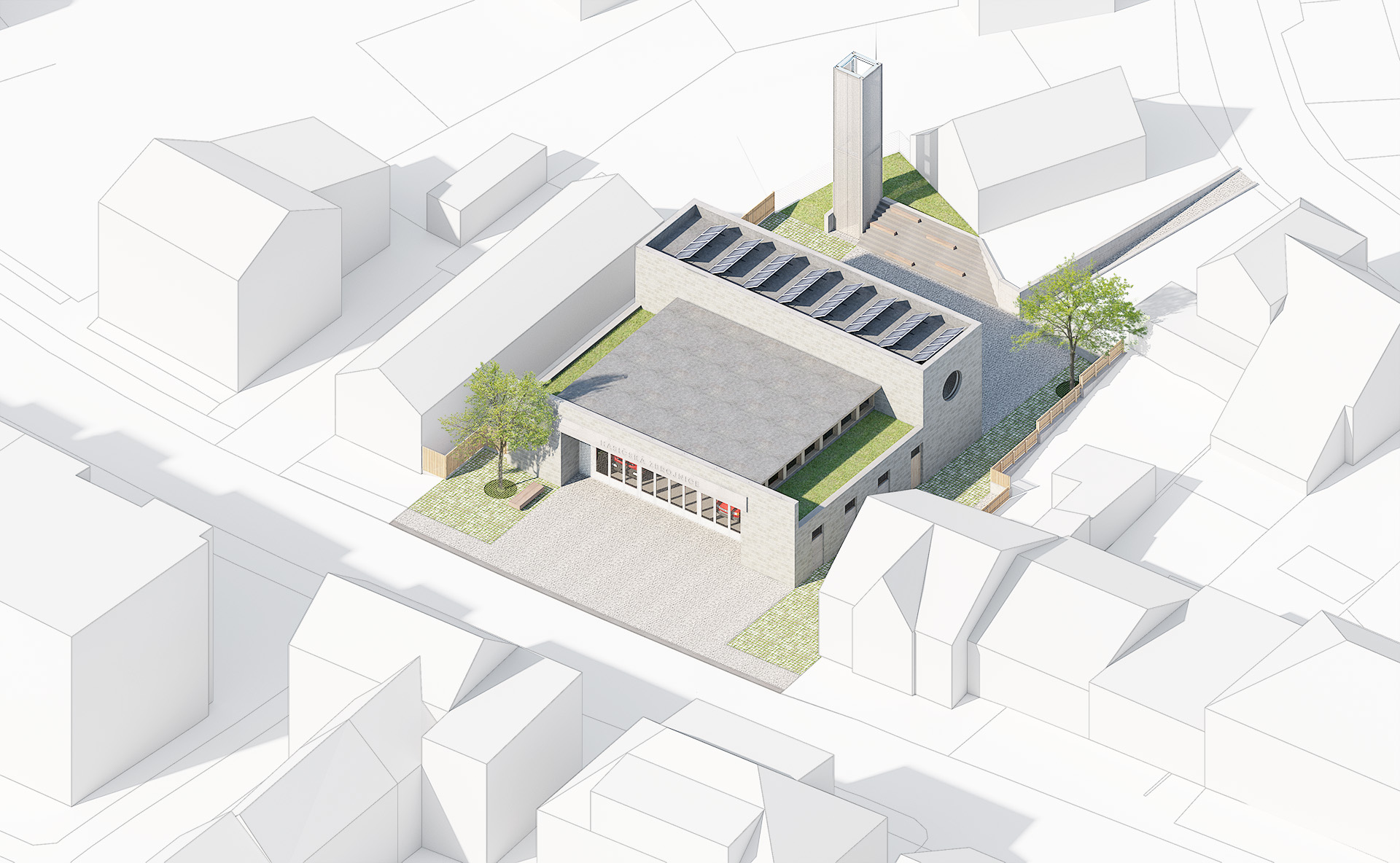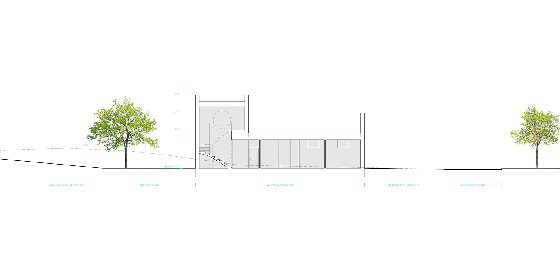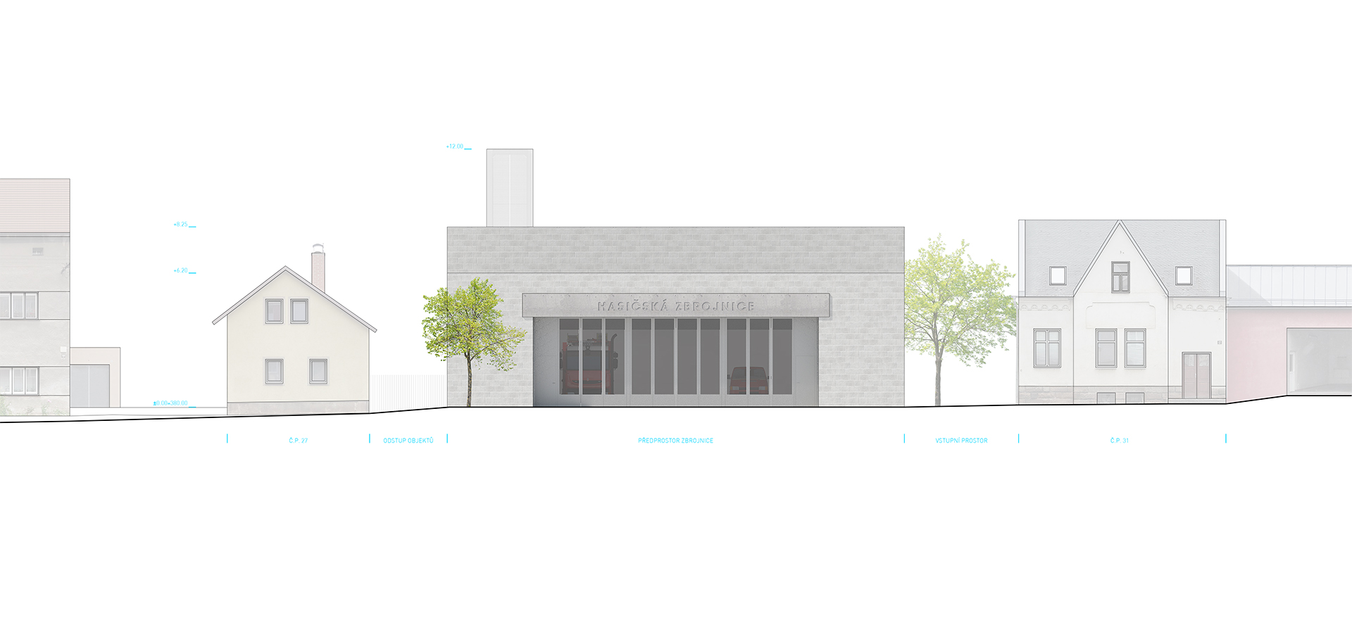 Budova nové hasičské zbrojnice je navržena jako velkorysý dům s centrální halou „srdcem“ pro požární techniku. Návrh je vsazen do stávající proluky, na rušné Dobrovského ulici. Dům svým odsazením od komunikace vytváří záliv veřejného prostoru s novým stromem, zachovává možnost průchod do ulice Hradební. Za objektem je navržen provozní dvůr pro údržbu hasičské techniky nebo případné komunitní události. Mezi pevné a „plné“ fasády provozního zázemí je umístěn volný prostor centrální haly – garáže a společenské místnosti. Propojitelnost společenské místnosti s garáží a provozním dvorem umožňuje průjezd vozidel a variabilní využití prostorů. Srdcem domu se stává garáž s požární technikou a společenská místnost pro setkávání komunity dobrovolných hasičů.