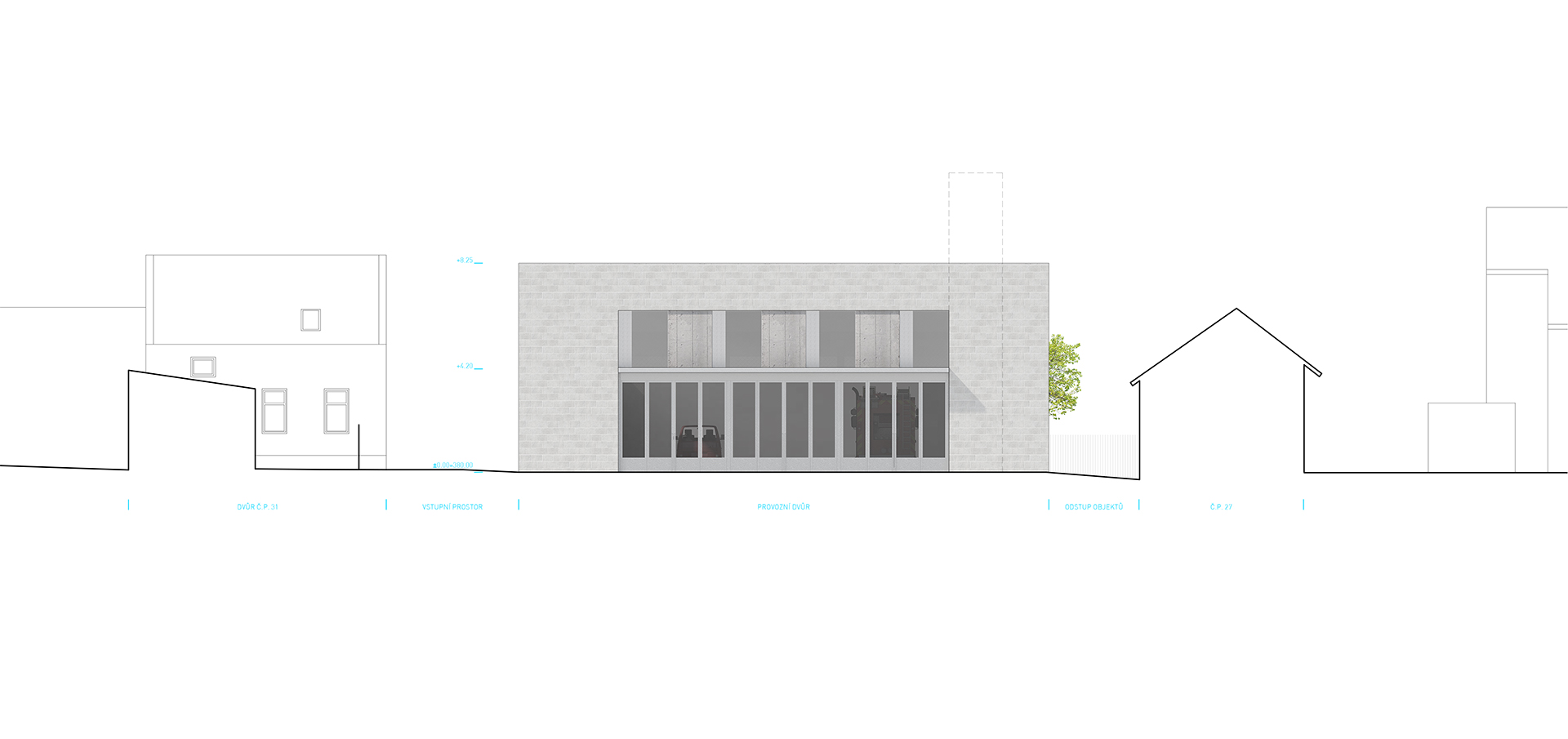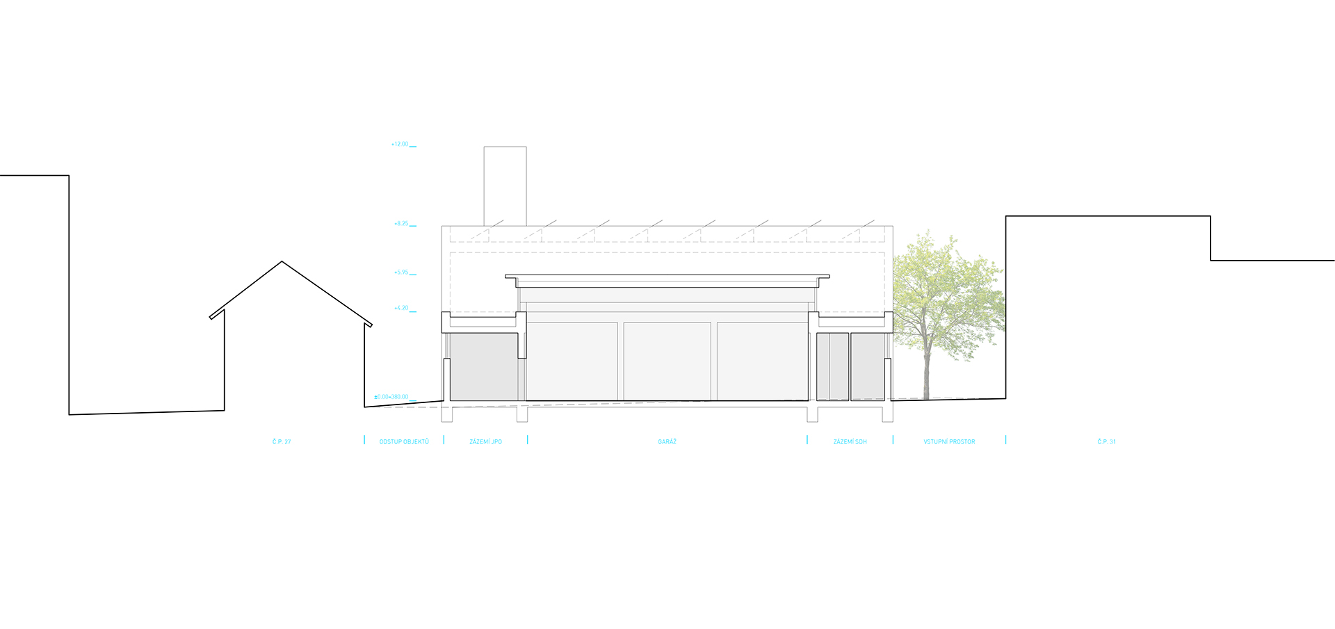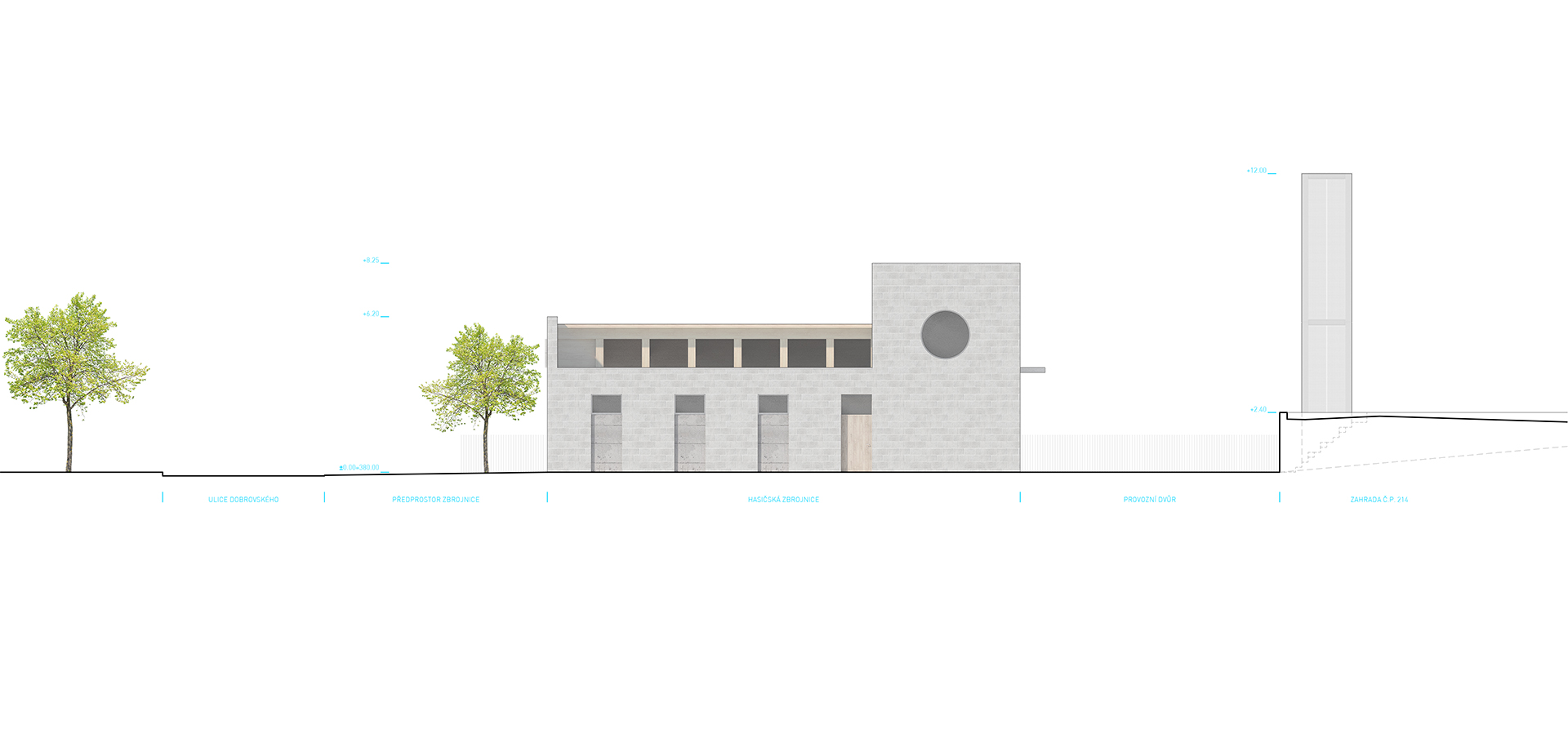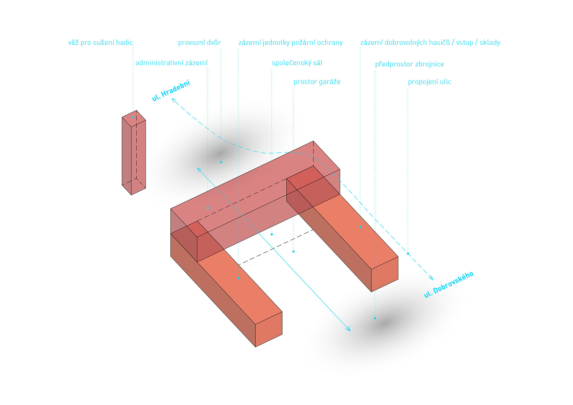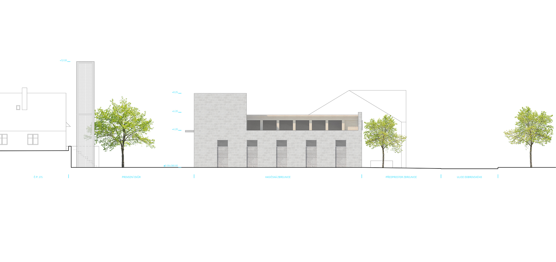 Věž pro sušení hadic chápeme jako provozní zařízení, proto je záměrně situována až do druhého plánu od ulice Dobrovského. Primární účel stavby akcentuje hasičská technika vystavená v garáži za prosklenými vraty.