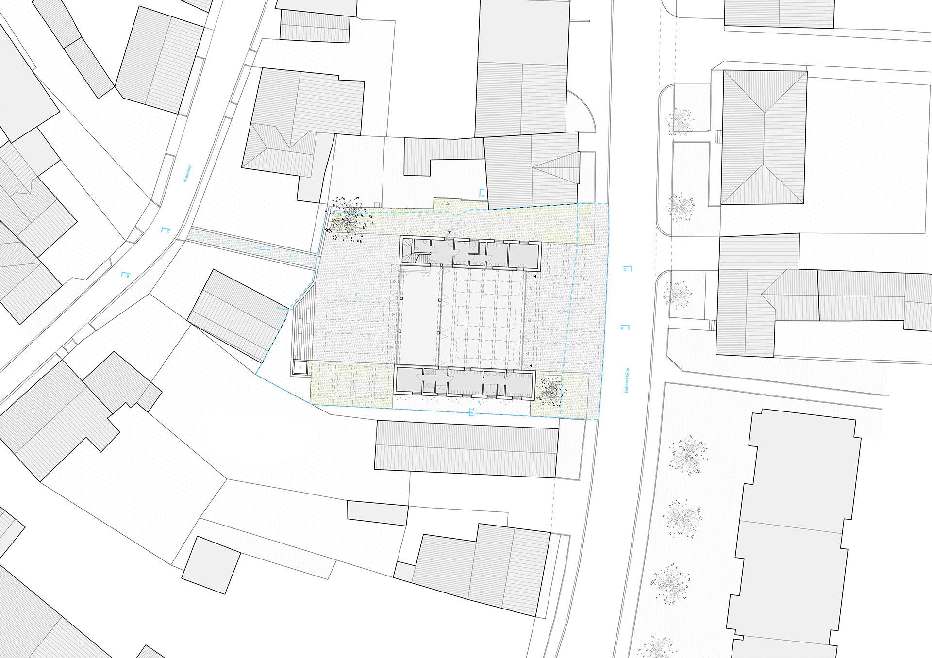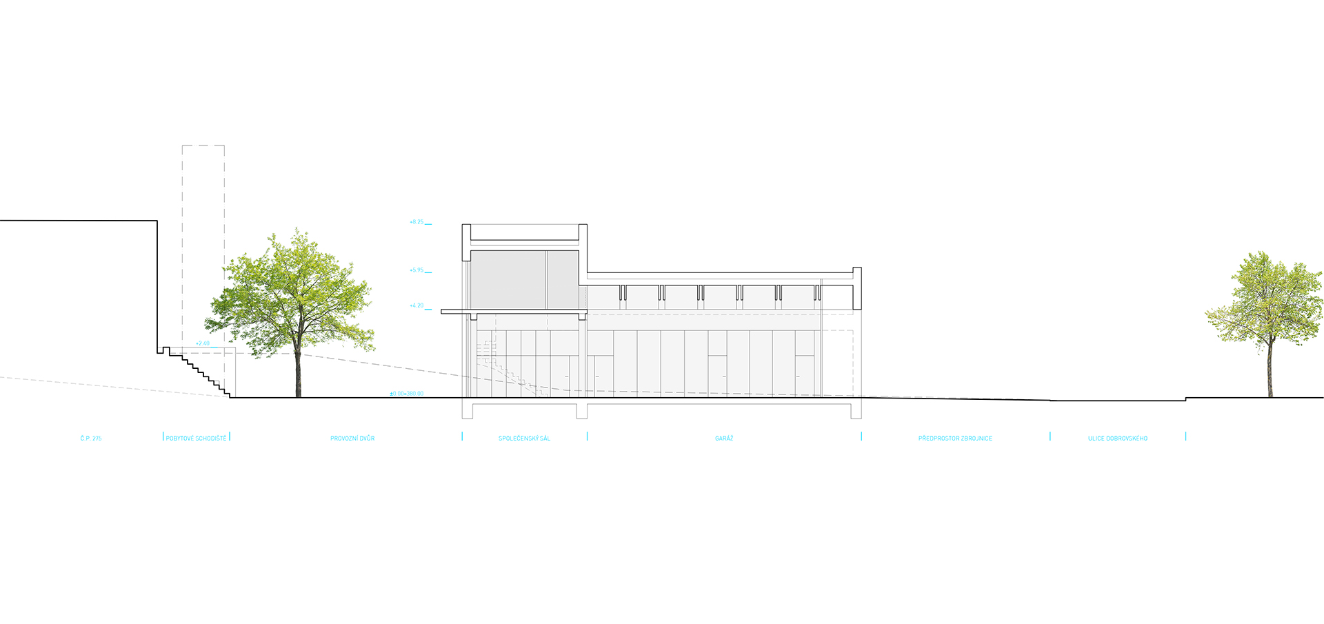 V prostoru za hasičkou zbrojnicí je v místě terénního zlomu navrženo pobytové schodiště ve formě „amfiteátru“.