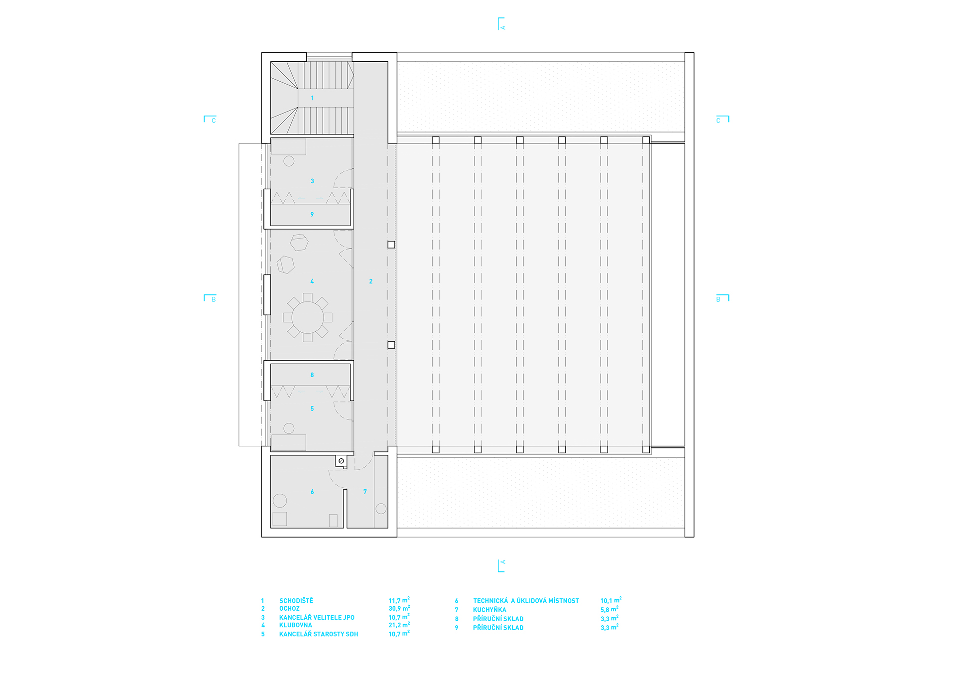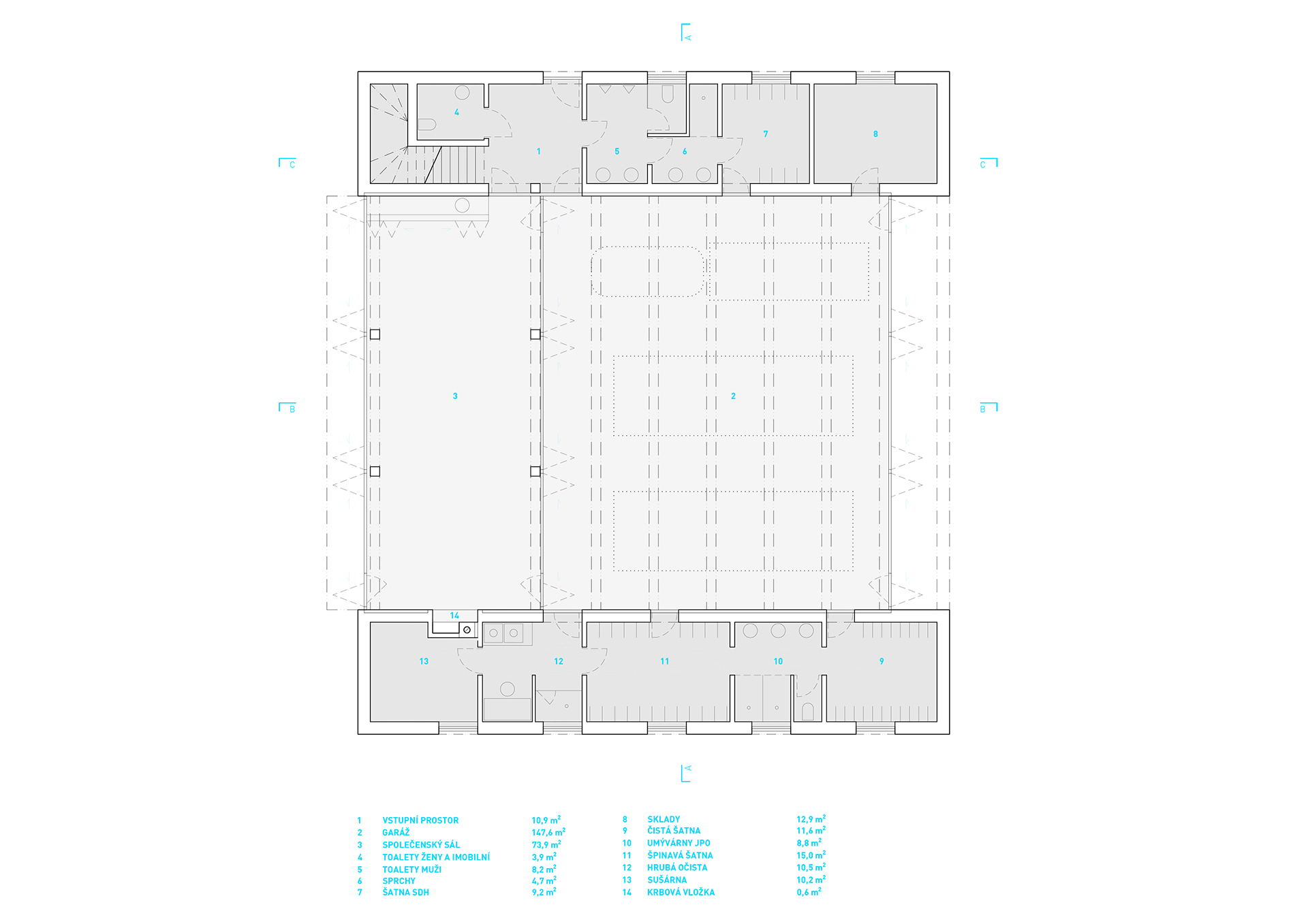 V přízemí je umístěno provozní zázemí hasičské zbrojnice, garáž a společenská místnost. V případě větší společenské události umožňuje variabilita dispozice spojení prostoru garáže, společenské místnosti a eexteriéru.