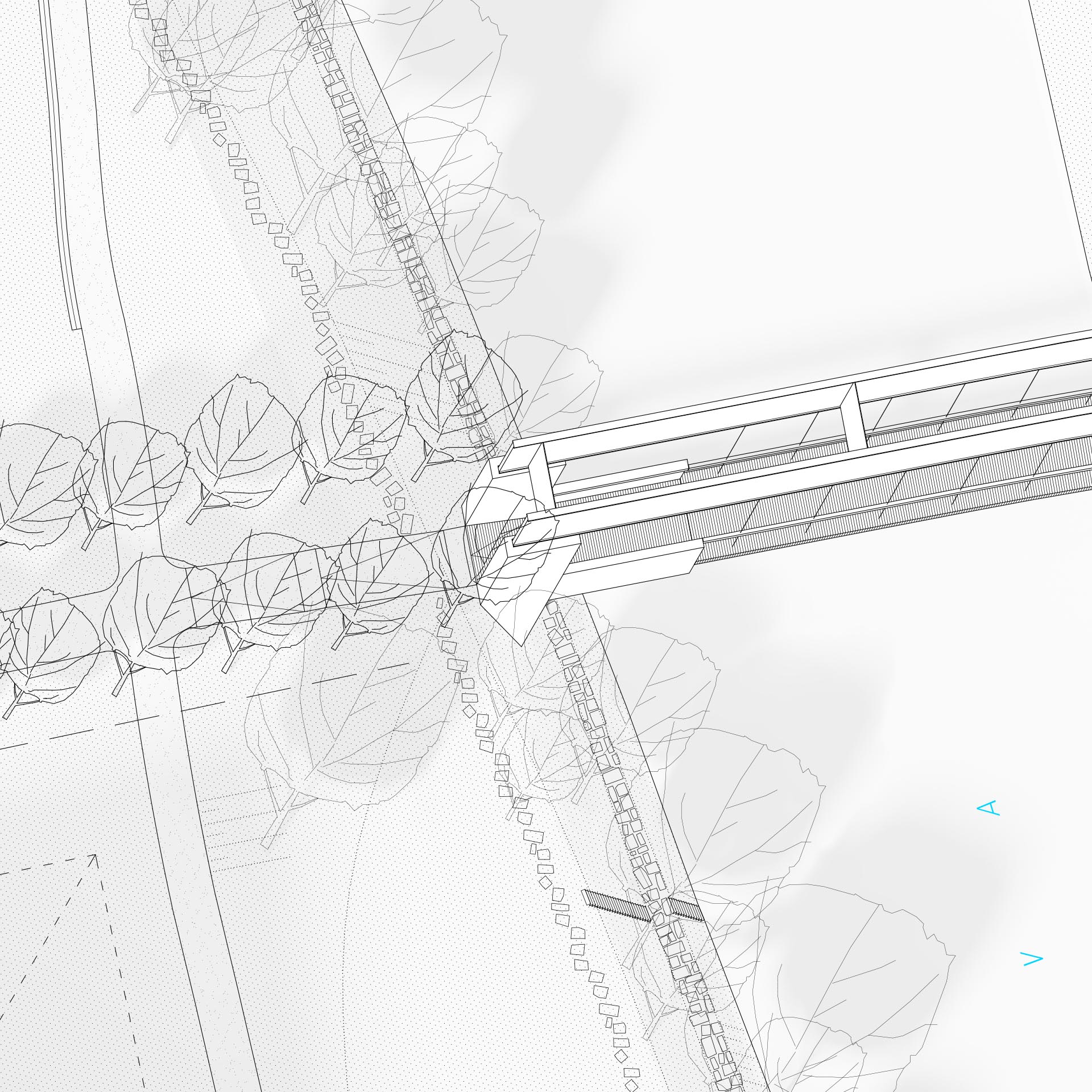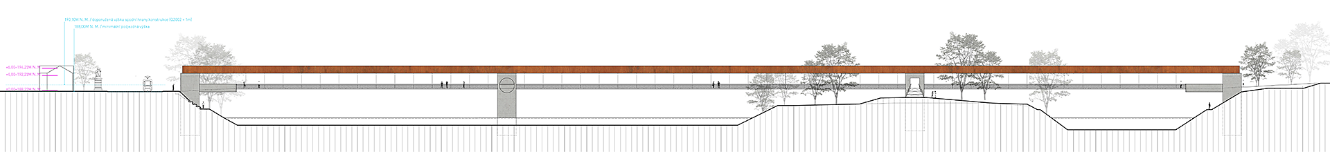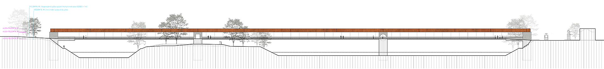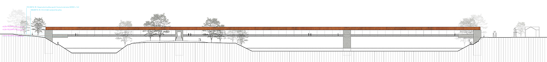 Předepsaná minimální světlá výška pro dolní plavební kanál a snaha o co nejjednodušší propojení obou břehů nás vede ke zvolení trámové konstrukce, na kterou je zavěšená konstrukce pochozí lávky. Toto řešení umožnuje jednoduché propojení, aniž by nosná konstrukce ovlivňovala průtok vody v případě povodně. Vytvořili jsme lávku lapidární, která je příjemnou komunikací s úzkou vazbou na hladinu řeky a ostrov Štvanici. Pochozí plocha je při její konstantní výšce v nejnižší přípustné vzdálenosti od hladiny řeky. Domníváme se, že přirozené řešení bez komplikovaných mimoúrovňových nástupů je nutný předpoklad pro vytvoření nové příjemné městské spojnice pro pohodlné každodenní využití.