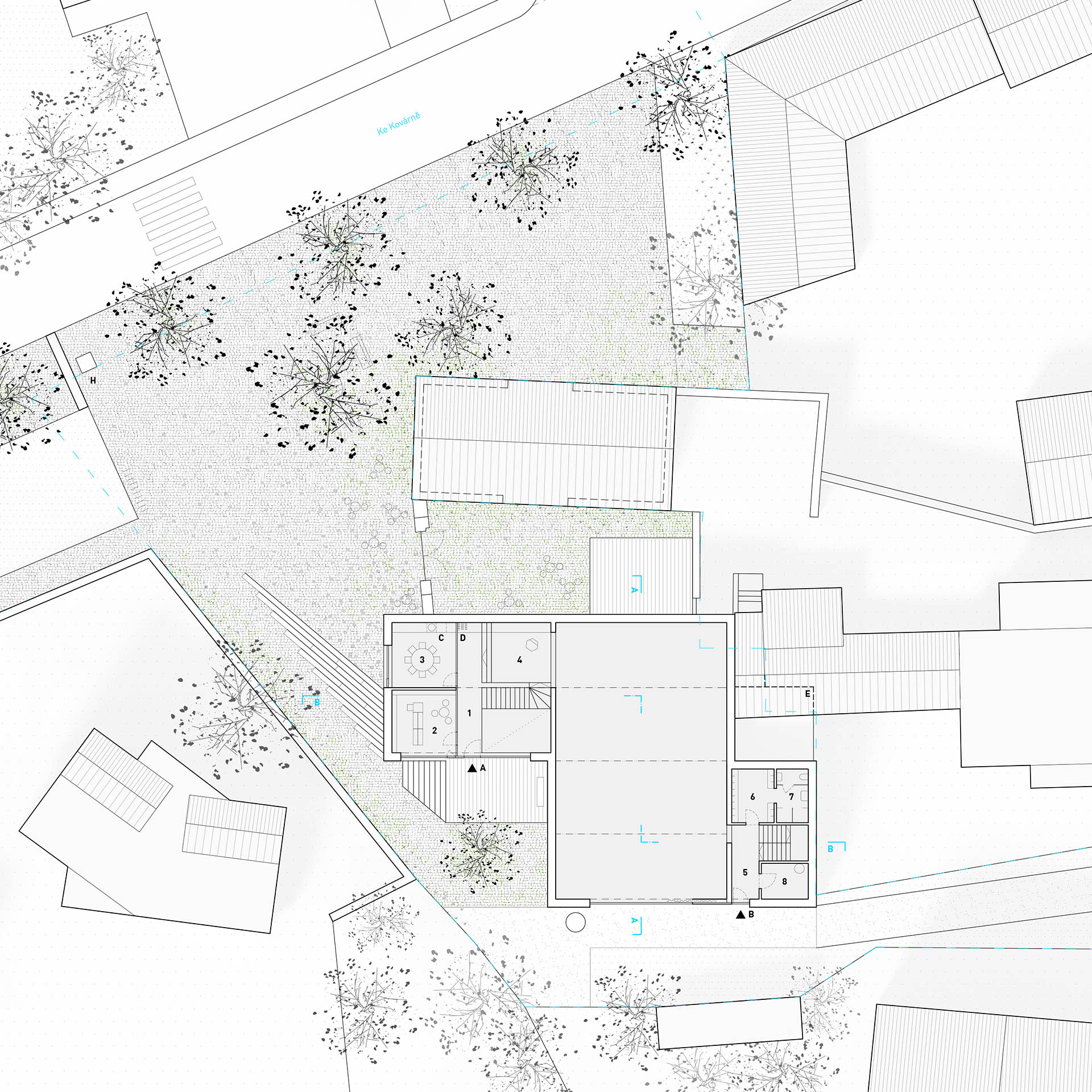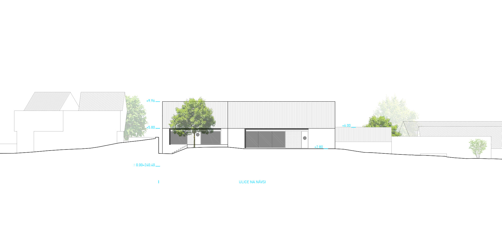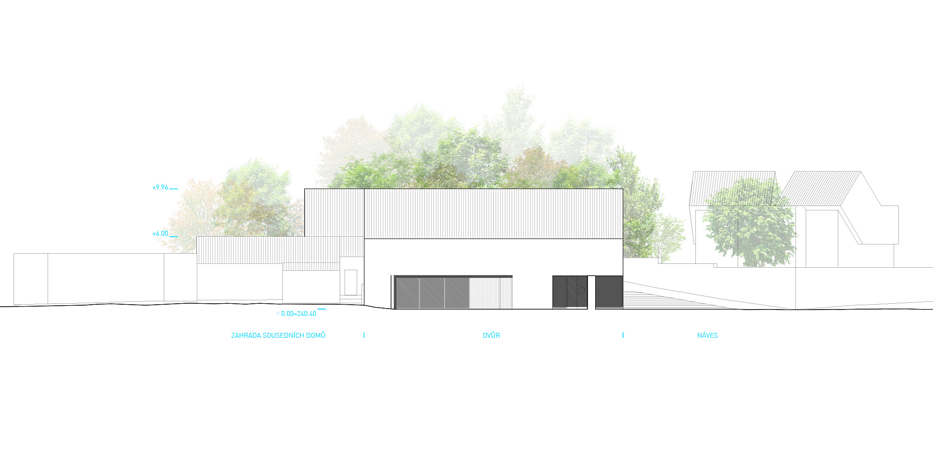K jižní fasádě domu v uličce Na Návsi je navržena intimní terasa se stromem a vstupem (bezbariérovým) pro knihovnu a klubovnu.
