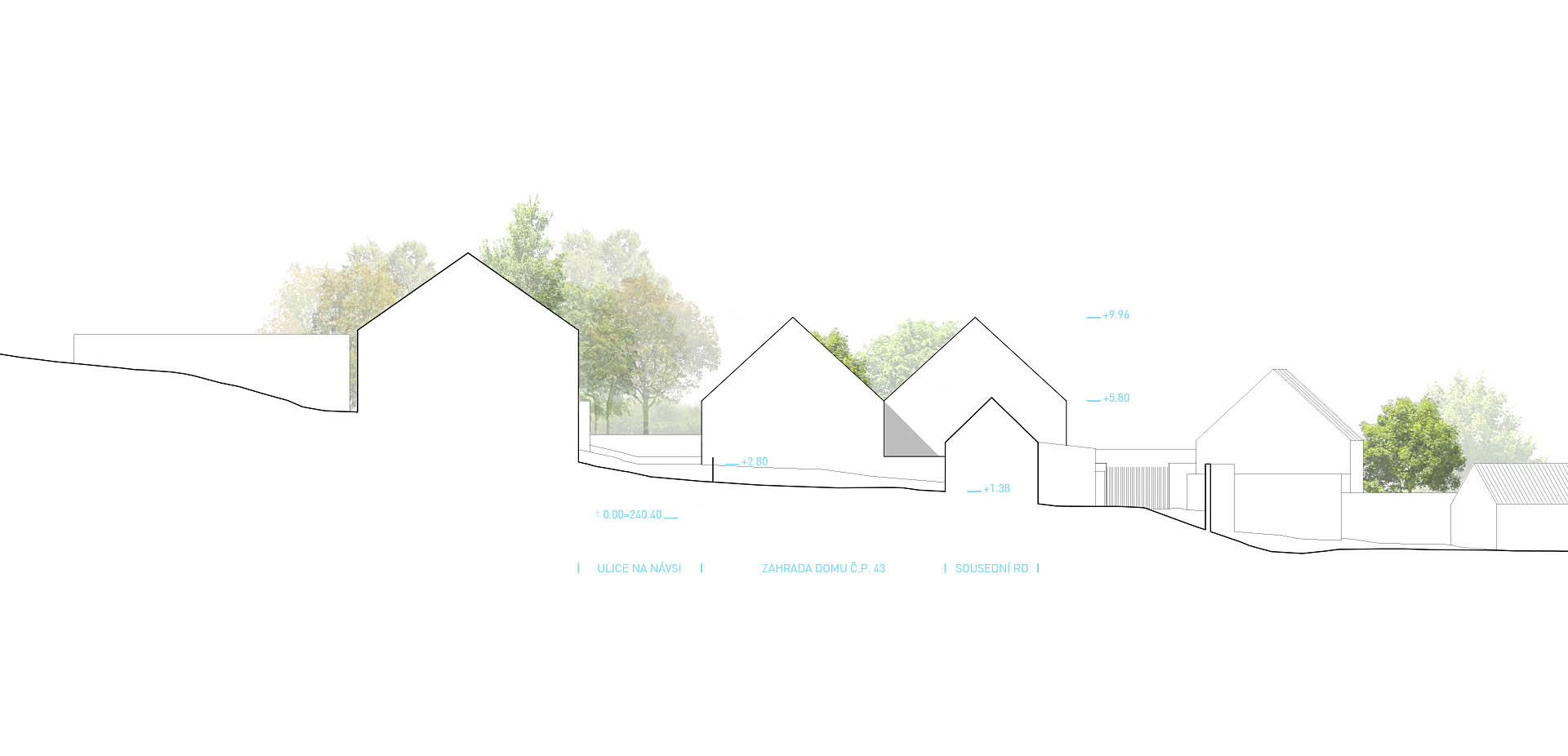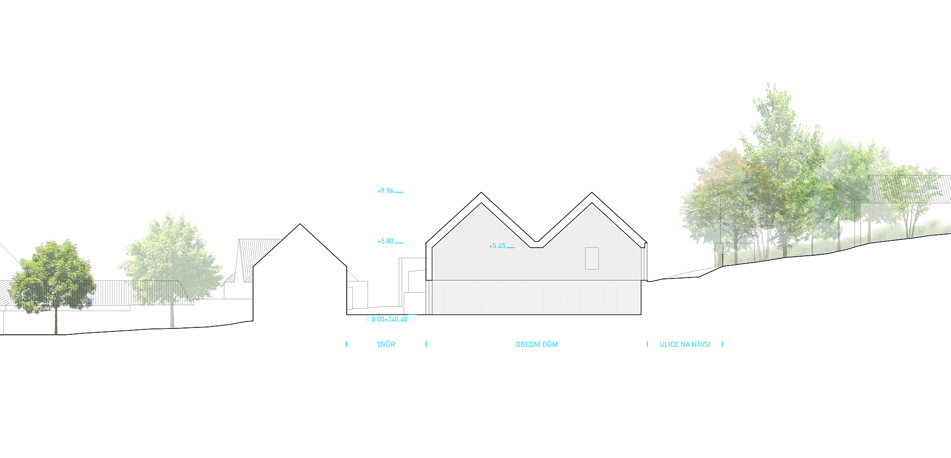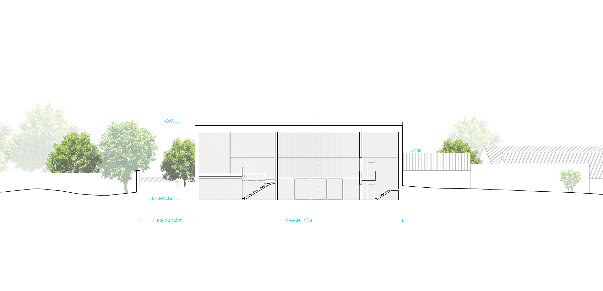 Nový obecní dům pro Panenské Břežany vnímáme jako soudobý funkční objekt jednoduše přístupný z úrovně návsi, objekt odkazující se na půdorysnou stopu původní stavby a svým architektonickým pojednáním navazující na archetyp vesnického domu se sedlovou střechou. Obecní sál a hlavní vstup domu umísťujeme na úroveň stávající vjezdové brány do dvora vedle sousední stodoly. Hlavní vnitřní prostory jsou tak přirozeně (bezbariérově) provázány s okolním veřejným prostorem. Vzniká tak dům se dvěma podélnými sedlovými střechami, které kryjí příčně orientovaný sál, jenž svou koncepcí s dvěma okny odkazuje na příčně průjezdné stodoly s dvěma vraty.
