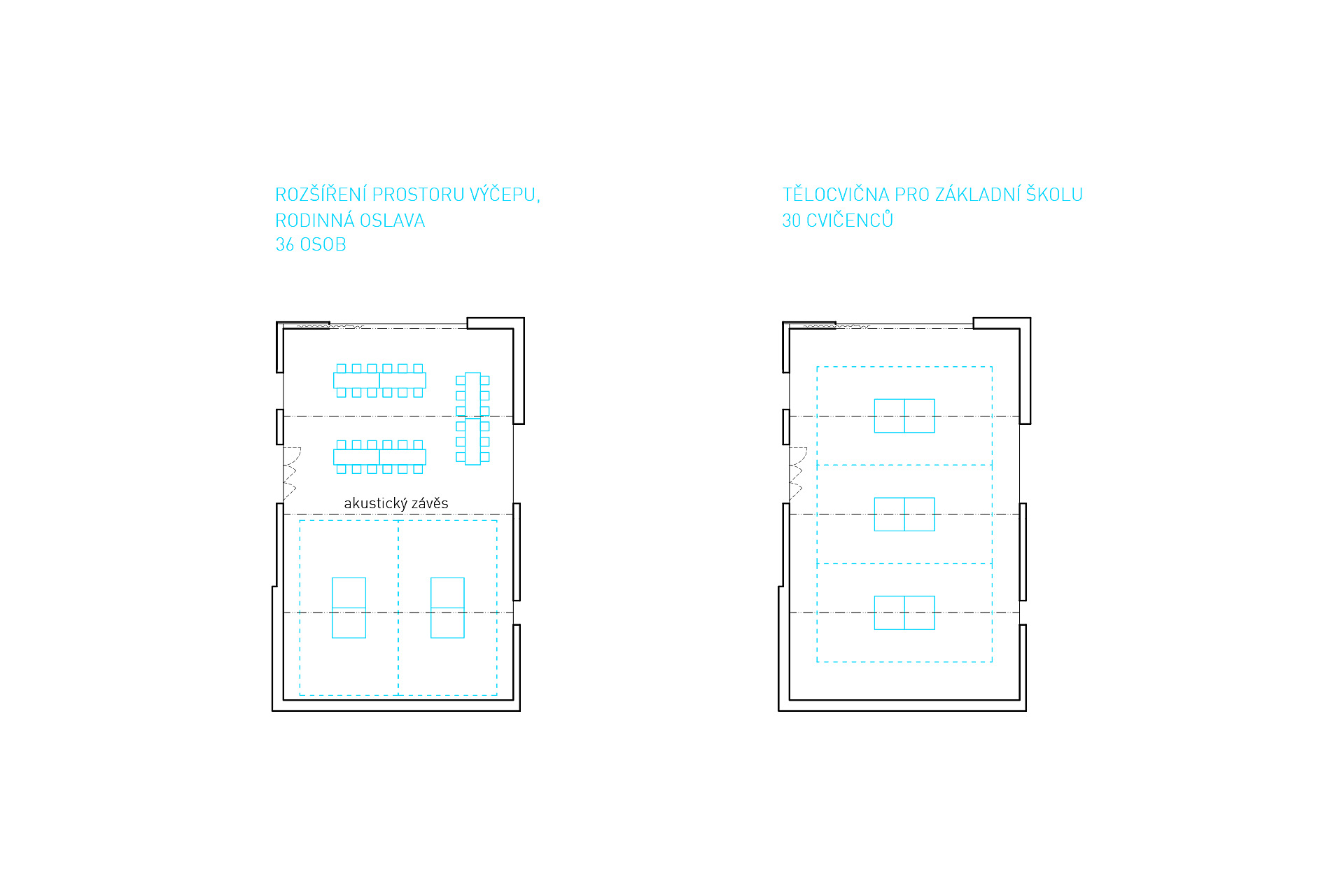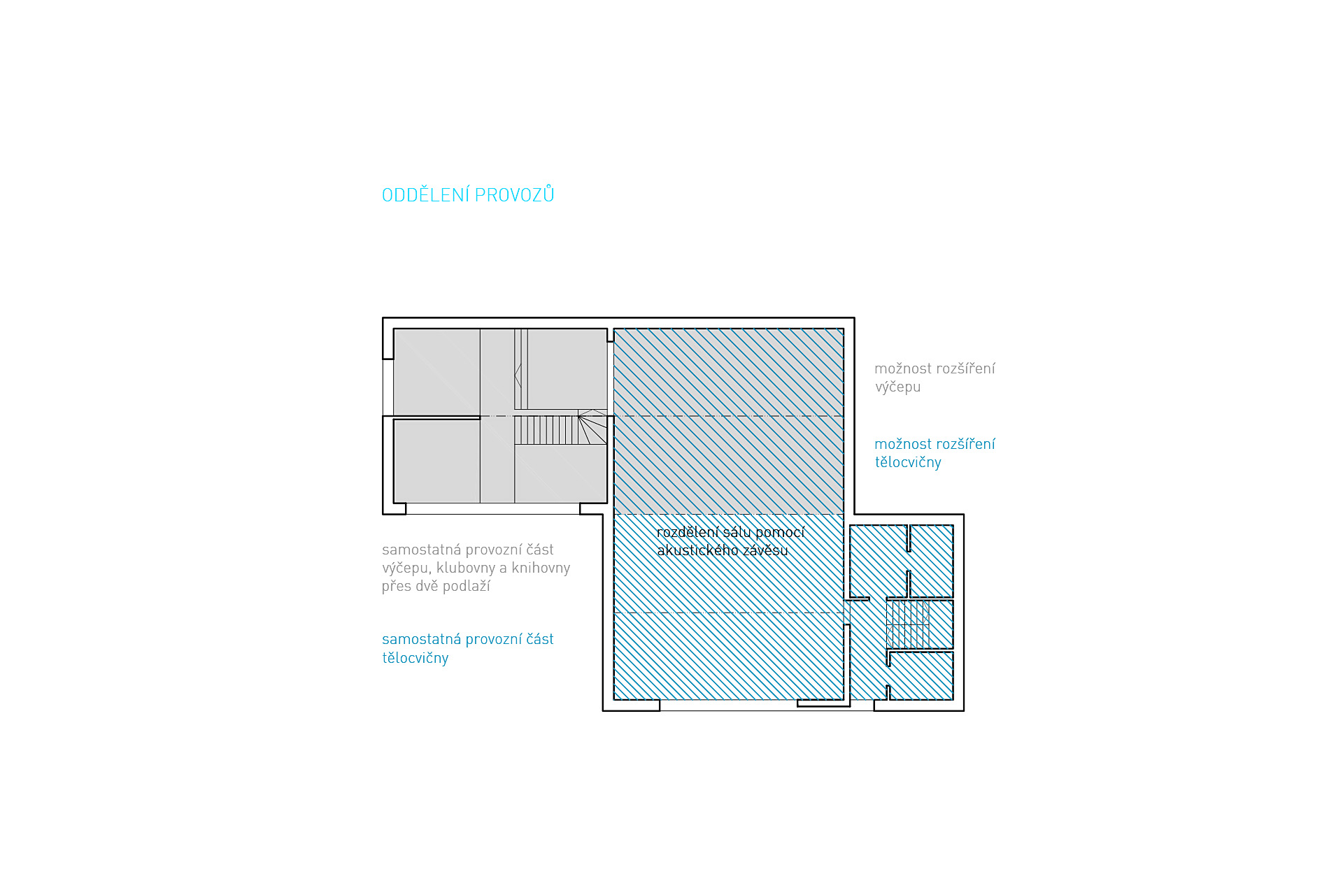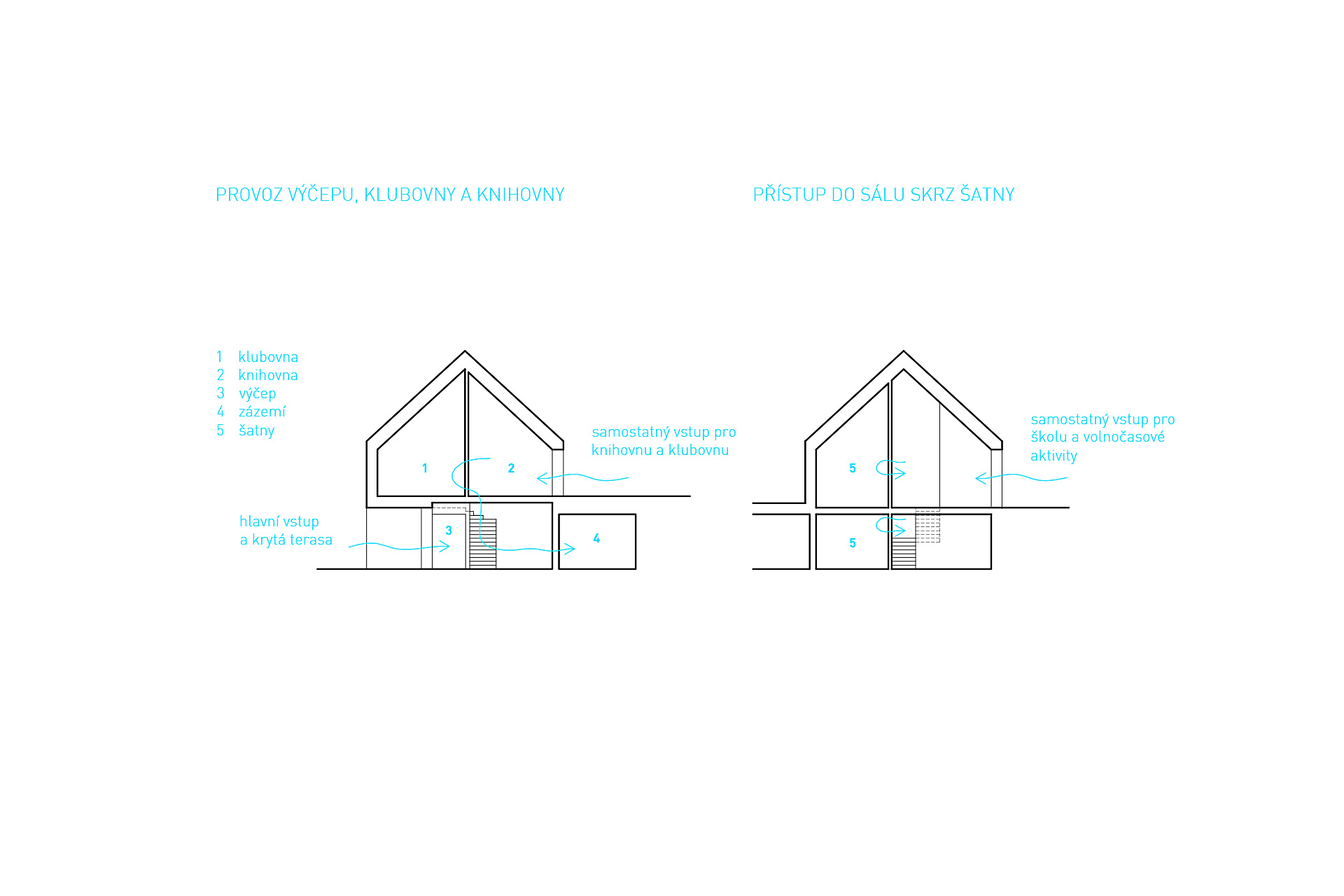 Objekt je přístupný třemi samostatnými vstupy. Do návsi je orientován hlavní vstup, na který navazuje prostor předsálí, výčep, toalety pro návštěvníky a přístup do hlavního sálu. Strop v části předsálí je vynechán, pohledově i schodištěm je úroveň hlavního vstupu propojena s úrovní v „podkroví“, kde je navržena knihovna a prostor klubovny doplněný o víceúčelový prostor galerie. Šatna pro návštěvníky není pevně definována, odkládání oděvů je koncipováno flexibilně. Řešení by mělo reagovat na požadavky konkrétní události. Lze uvažovat s řešením pomocí mobilních pultů a věšáků v prostoru předsálí, galerie nebo klubovny, alternativou je umístění stojanových věšáků přímo v prostoru sálu.