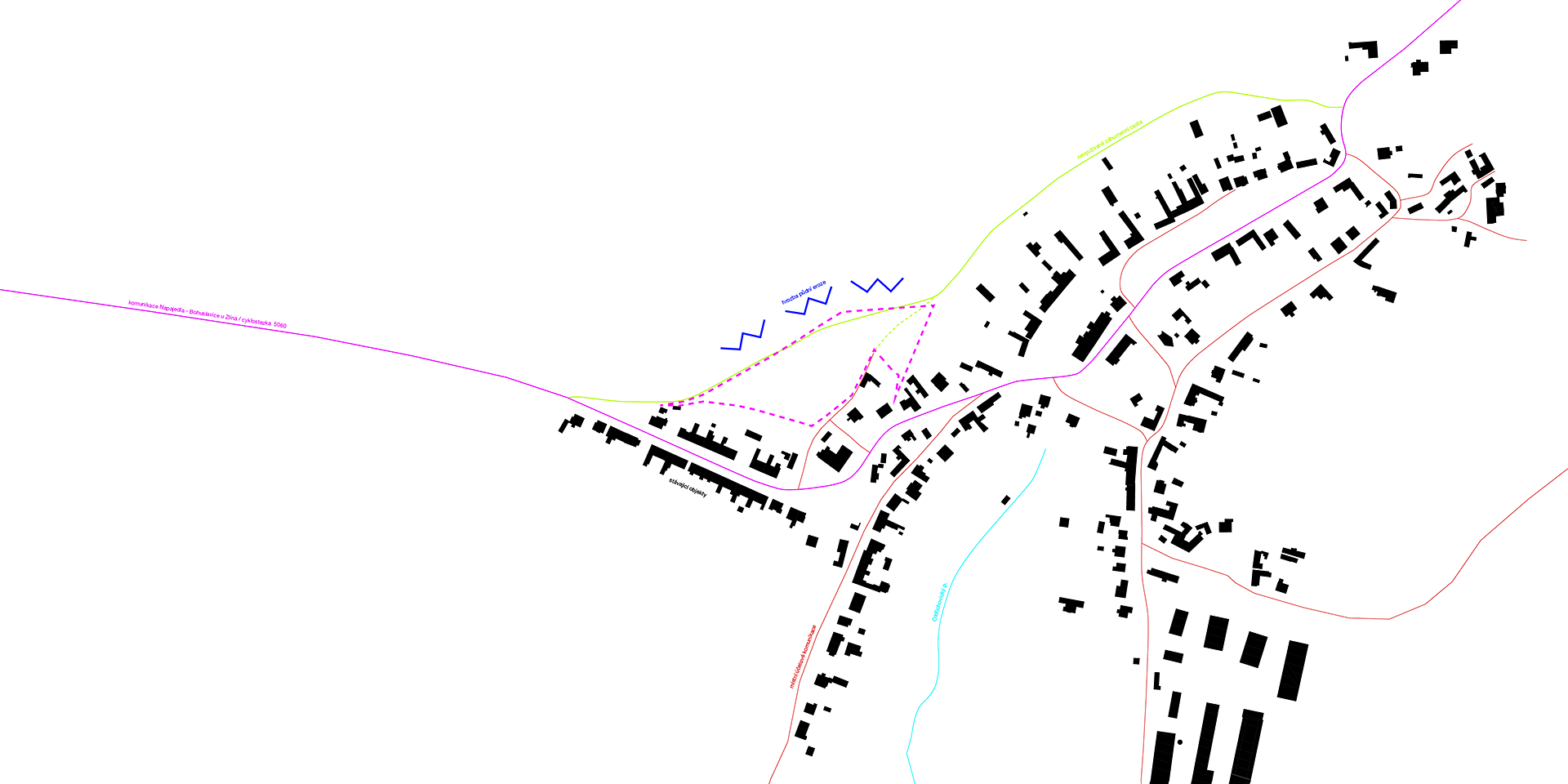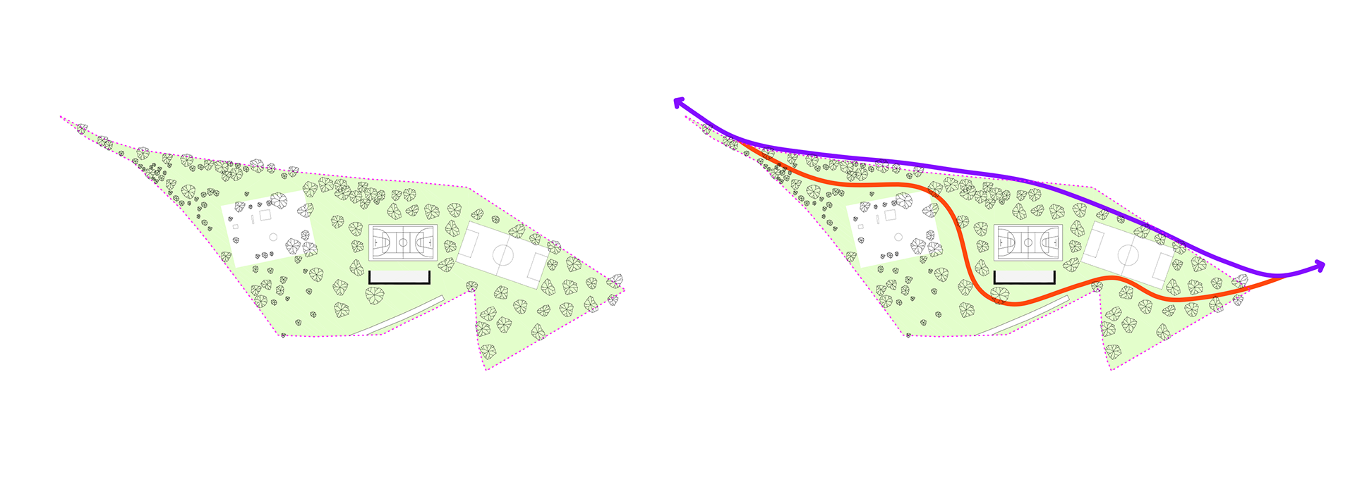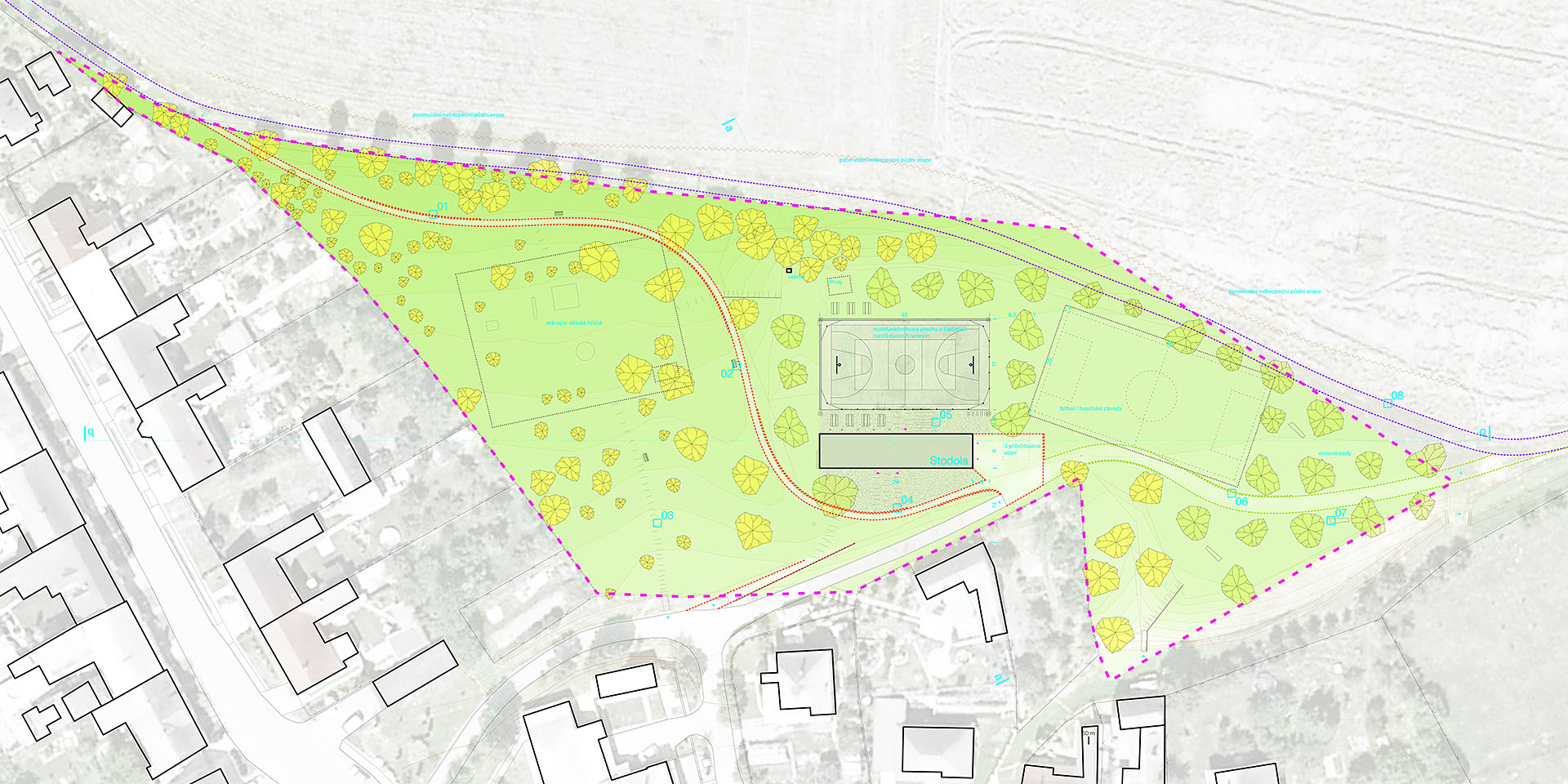 Zásadním prvkem v území je pěšina procházející od východního cípu na západ. Dík svému volnému tvarování propojuje všechny objekty nacházející se v území. Na východě navazuje na záhumení cestu, prochází nově založeným extenzivním sadem a dotýká se travnaté plochy pro malou kopanou. Ve své střední části prochází podél nového objektu stodoly a je navázána na rampu, jež je hlavním vstupem do areálu. Od kaštanu pokračuje dále severozápadním směrem ke stávajícímu dětskému hřišti a dále k západnímu cípu řešeného území, kde se opět napojuje na záhumení cestu.