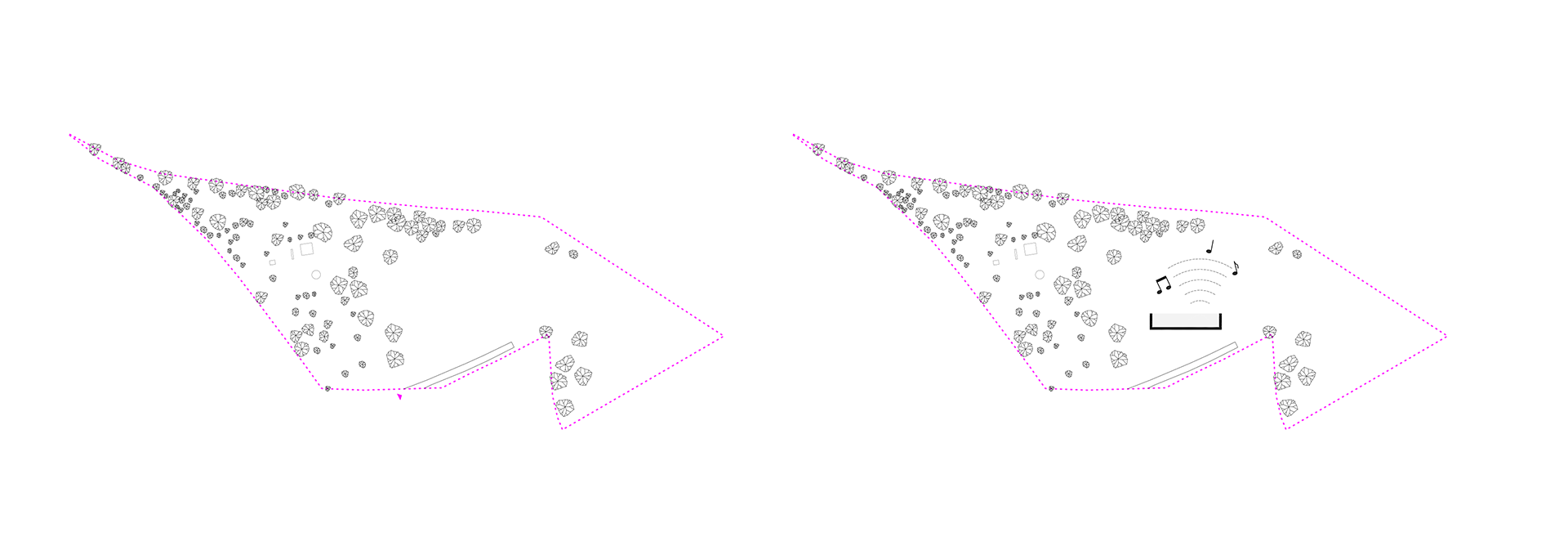 Objekt je koncipovaný jako jednopodlažní stavba s pultovou střechou pro sezonní využití, svým umístěním na niveletu stávajícího terénu minimalizuje potřebu zemních prací. Hlavní vstup je umístěn na jižní fasádě směřující do vesnice, zde se také nachází vstup do předprostoru sociálního zařízení a výdejní okénko občerstvení. Severozápadní fasádu směrem k multifunkční ploše (taneční parket) lze šesti páry rozměrných vrat kompletně otevřít.