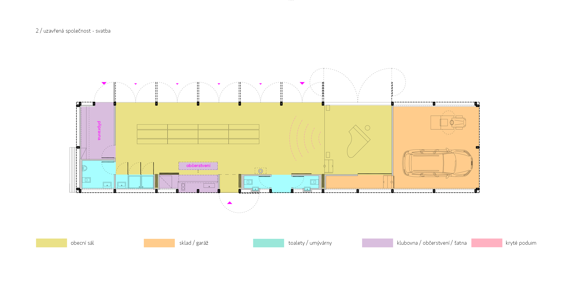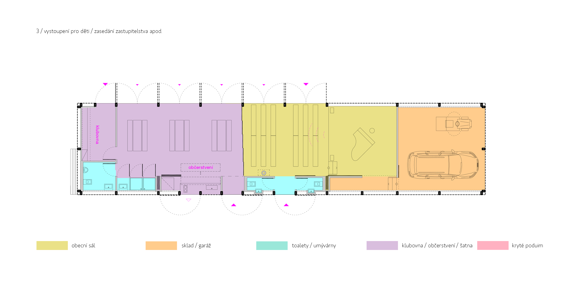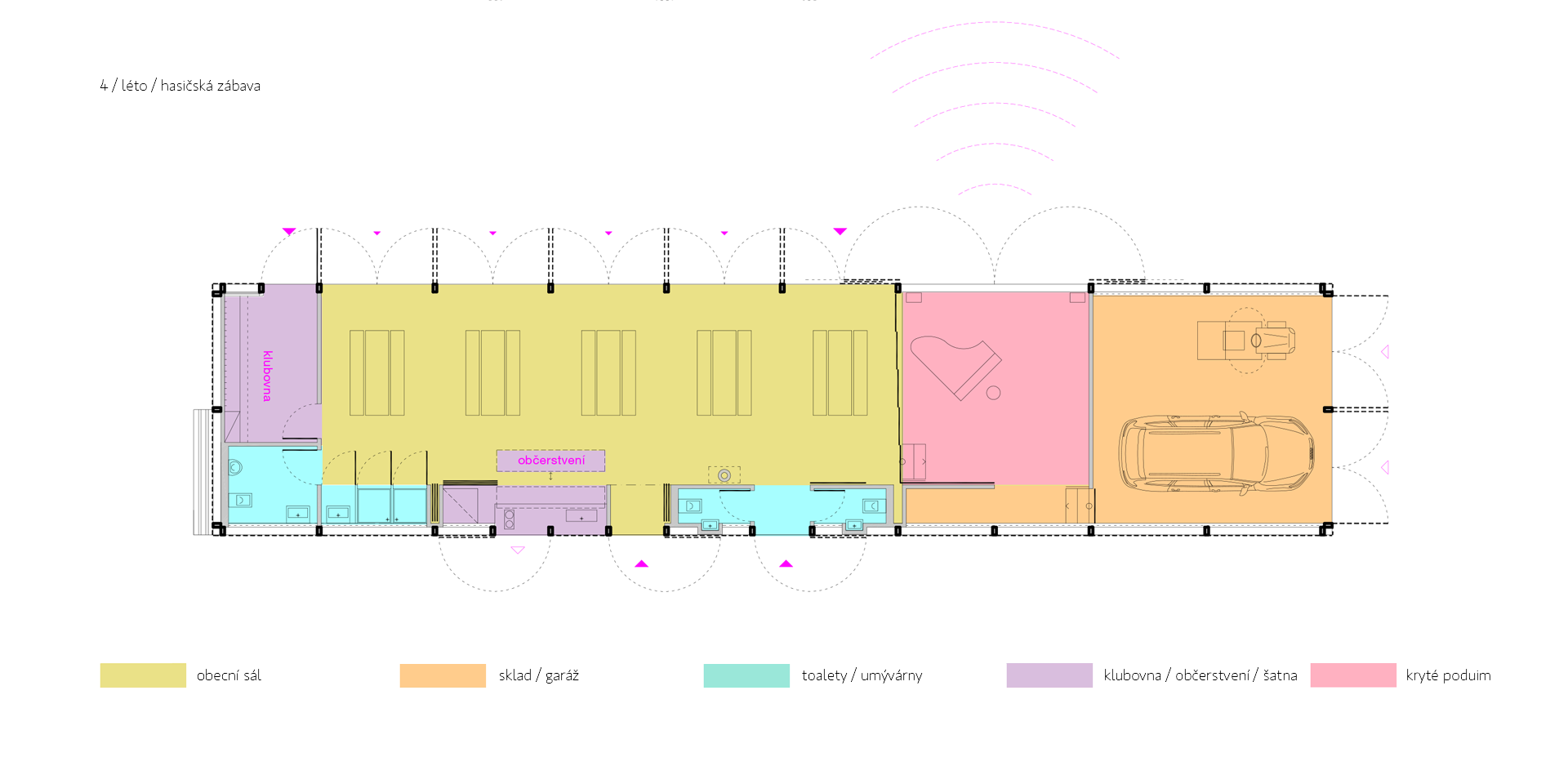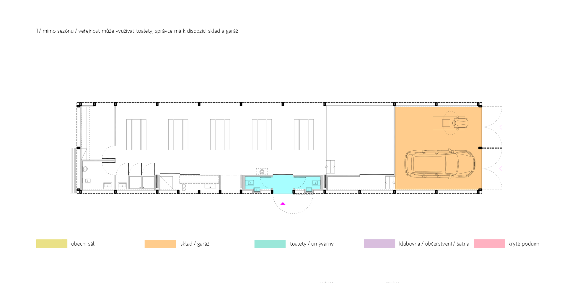 Objekt vesnického charakteru pro sezónní využití s minimálním potřebným technickým zázemím. “Stodola” poskytující útočiště pro občany (i návštěvníky) obce s ambicí stát se místem setkávání (zastavení).