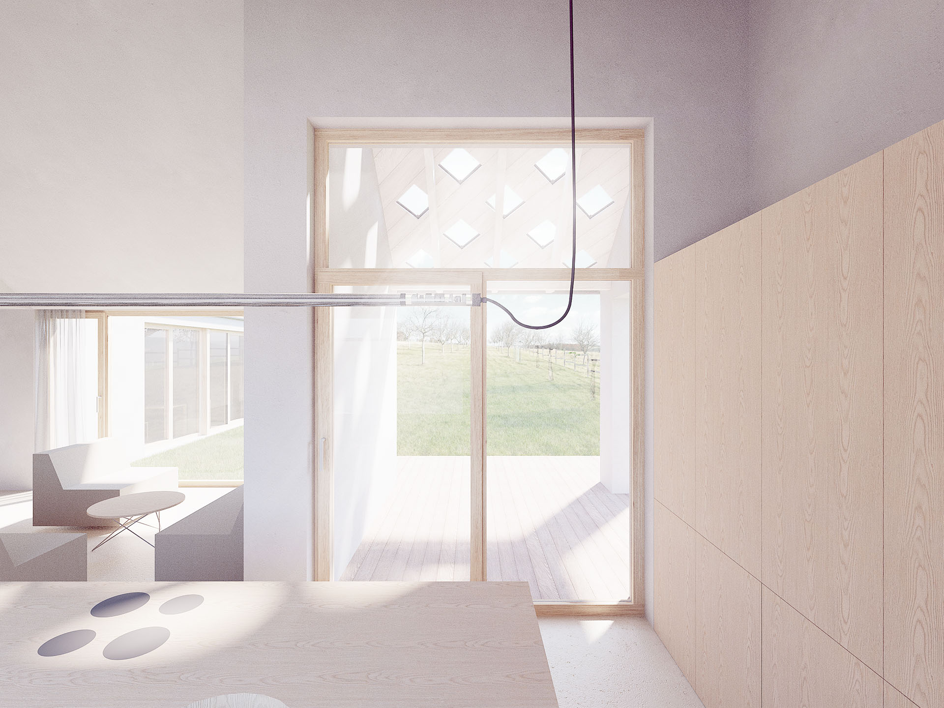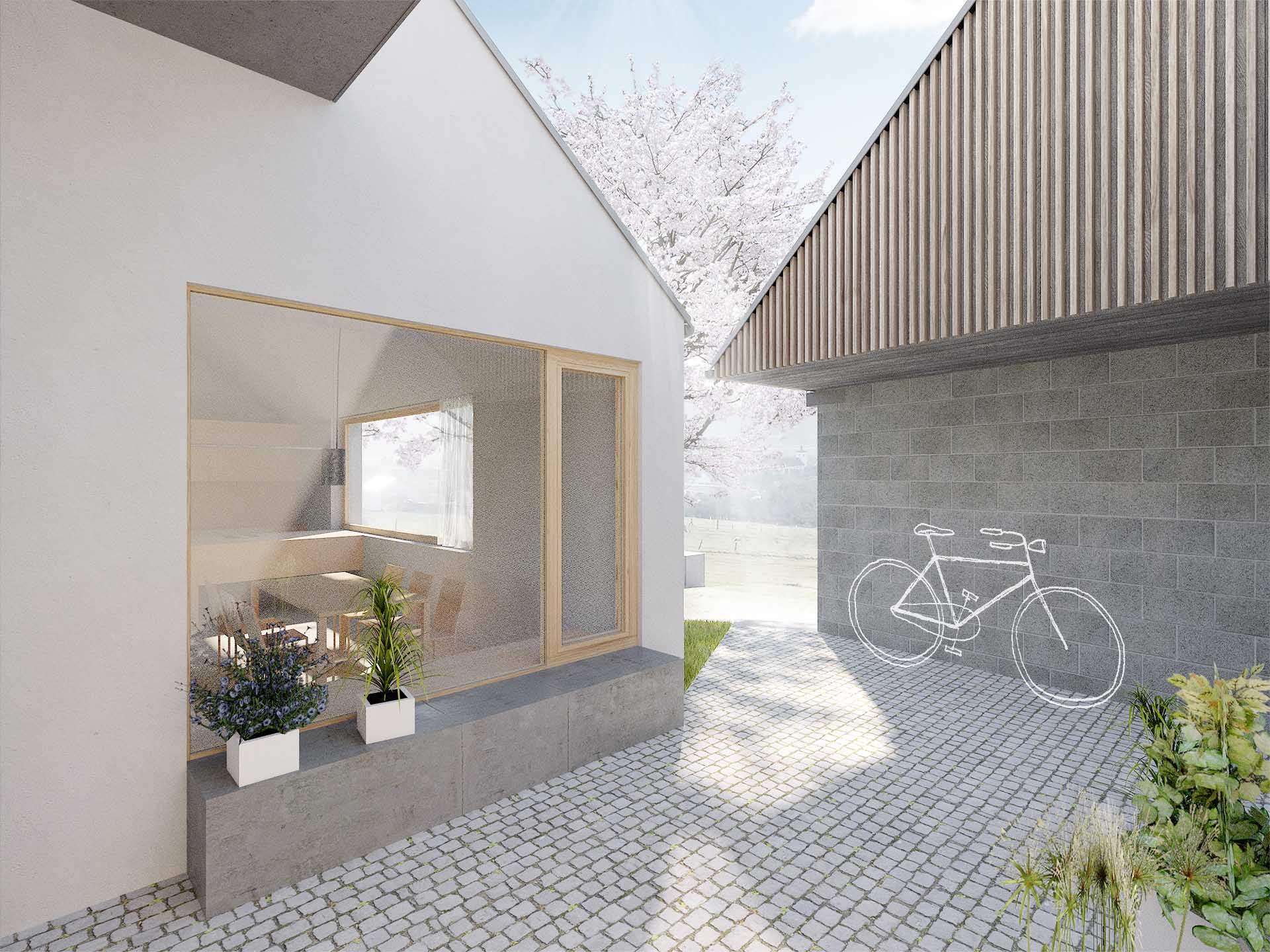 Ze stodoly pro povoz se stala garáž pro automobil s návazností na další obslužné místnosti domu. Světnice se vlivem v současnosti zažitých prostorových nároků stala jedním z objektů kompozice, stále však orientovaná jak do ulice, tak i do zahrady. Z každého bodu společenského prostoru je možné skrze jednu kompletně prosklenou stěnu pozorovat dění v zahradě, na terase a vstupním dvorku. Jihovýchodní roh objemu společenské části je věnován zálivu venkovní kryté terasy.