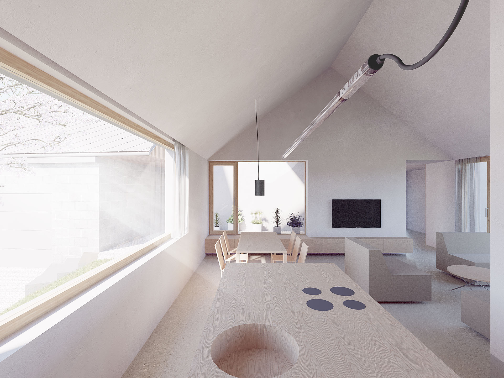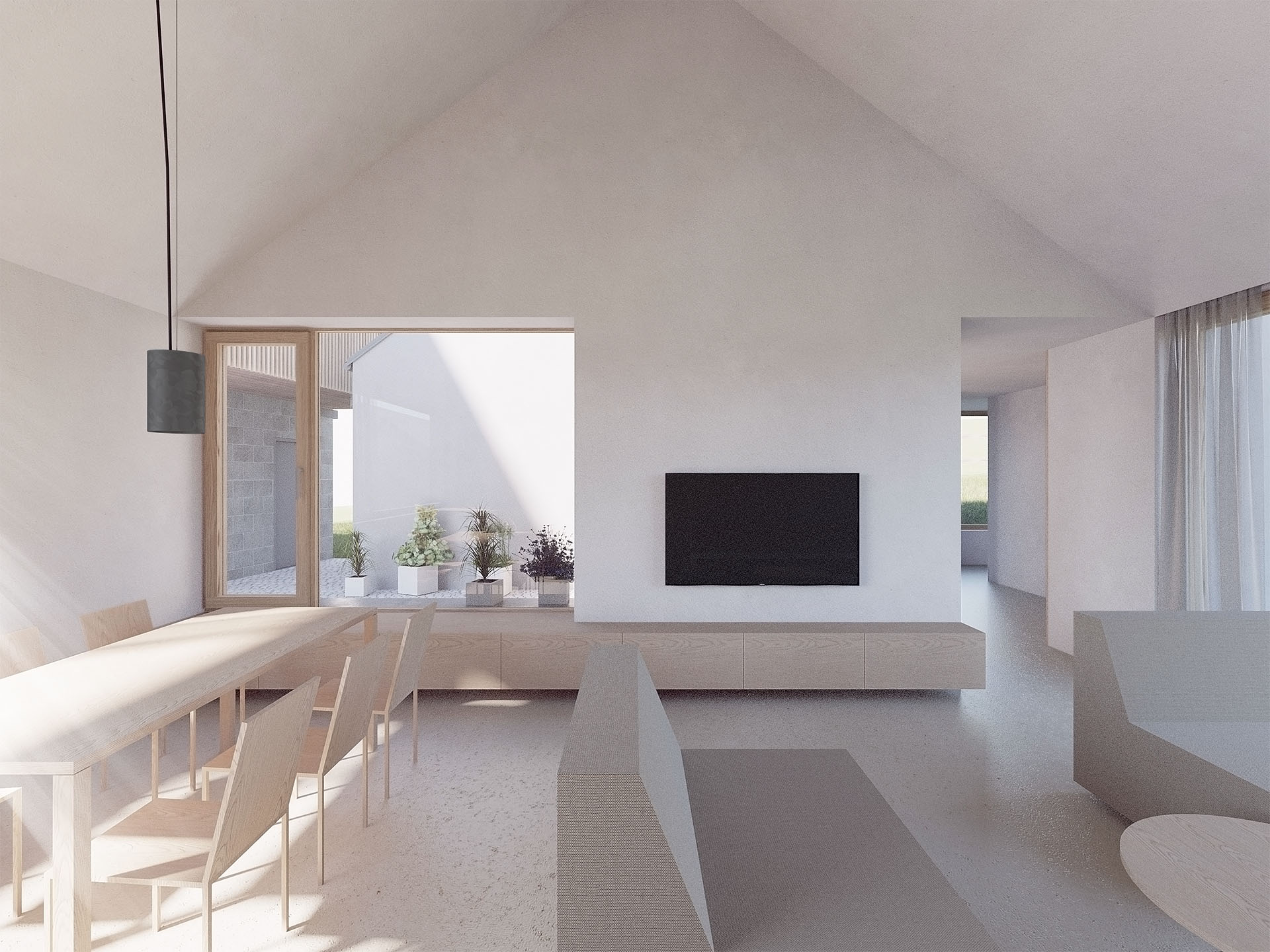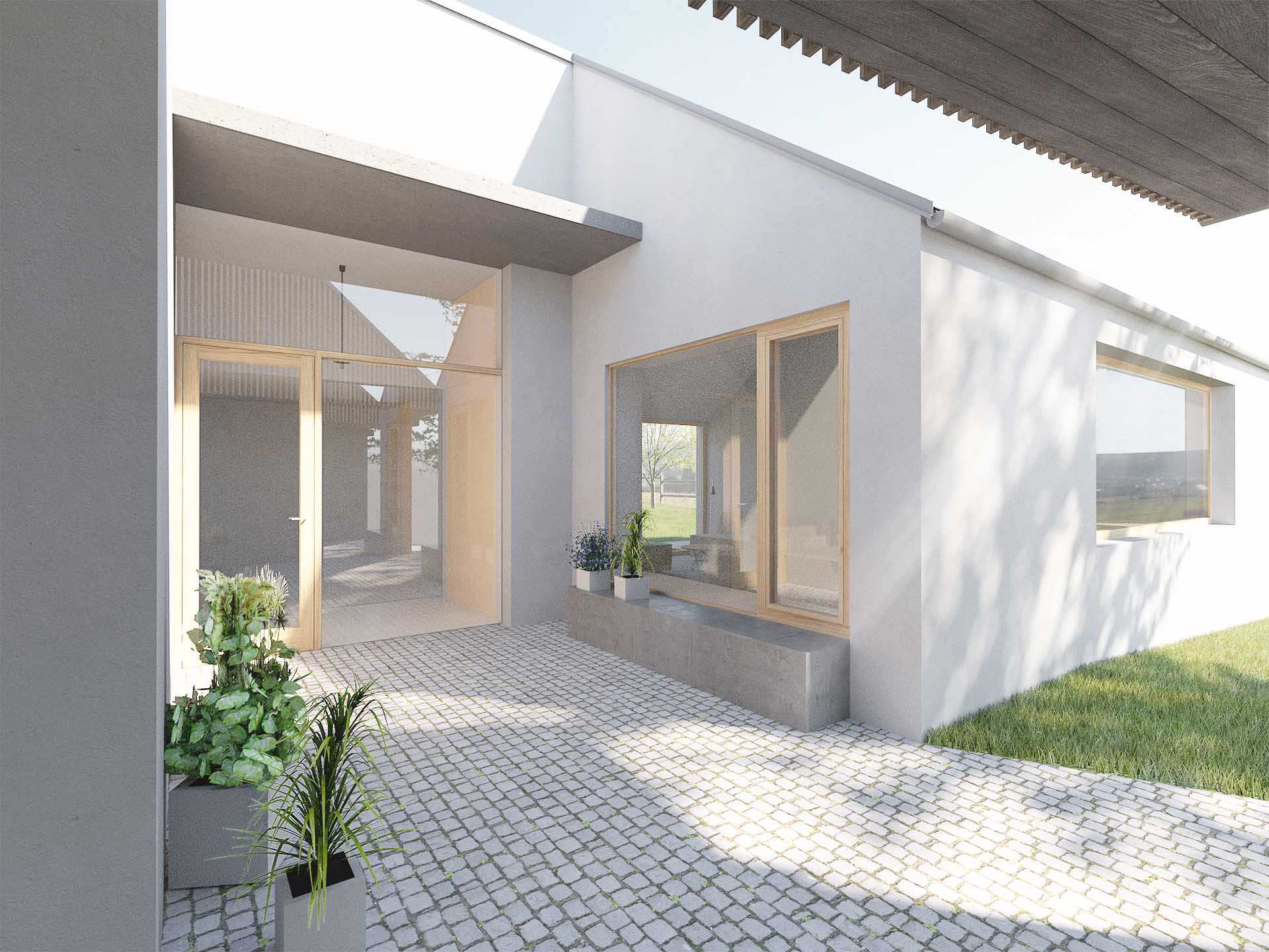 Sevřené uspořádání a tvarování objektů formuje vstupní dvorek, „betonovou zahradu“ u domu, závětrné místo, stinný plácek vizuálně propojený s jídelnou a obývacím pokojem. Vzniká vstupní prostor mezi interiérem a veřejným prostorem. Vstupuje se prakticky do středu domu, odtud se dispozice větví do dvou samostatných částí.