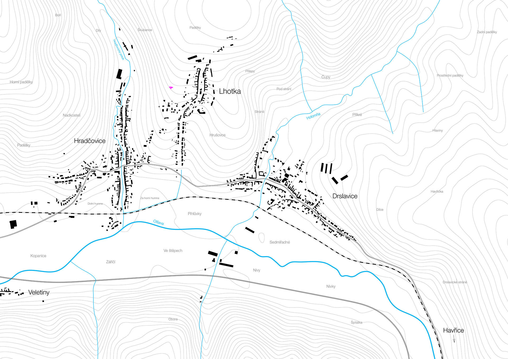 Obec Lhotka je utvářena jednou silnicí, která stoupá po svahu údolí řeky Olšavy. V horní třetině svahu se domy podél silnice rozestupují a utvářejí neformální náves s kapličkou svaté Barbory. Tato původní část obce je seskládána z klasických jednopodlažních řadových domů s hospodářským křídlem do dvorů. Paralelně s hlavní osou obce vedou dvě záhumenní cesty, které ukončují zahrady domů a na vrcholu kopce se spojují s hlavní silnicí.