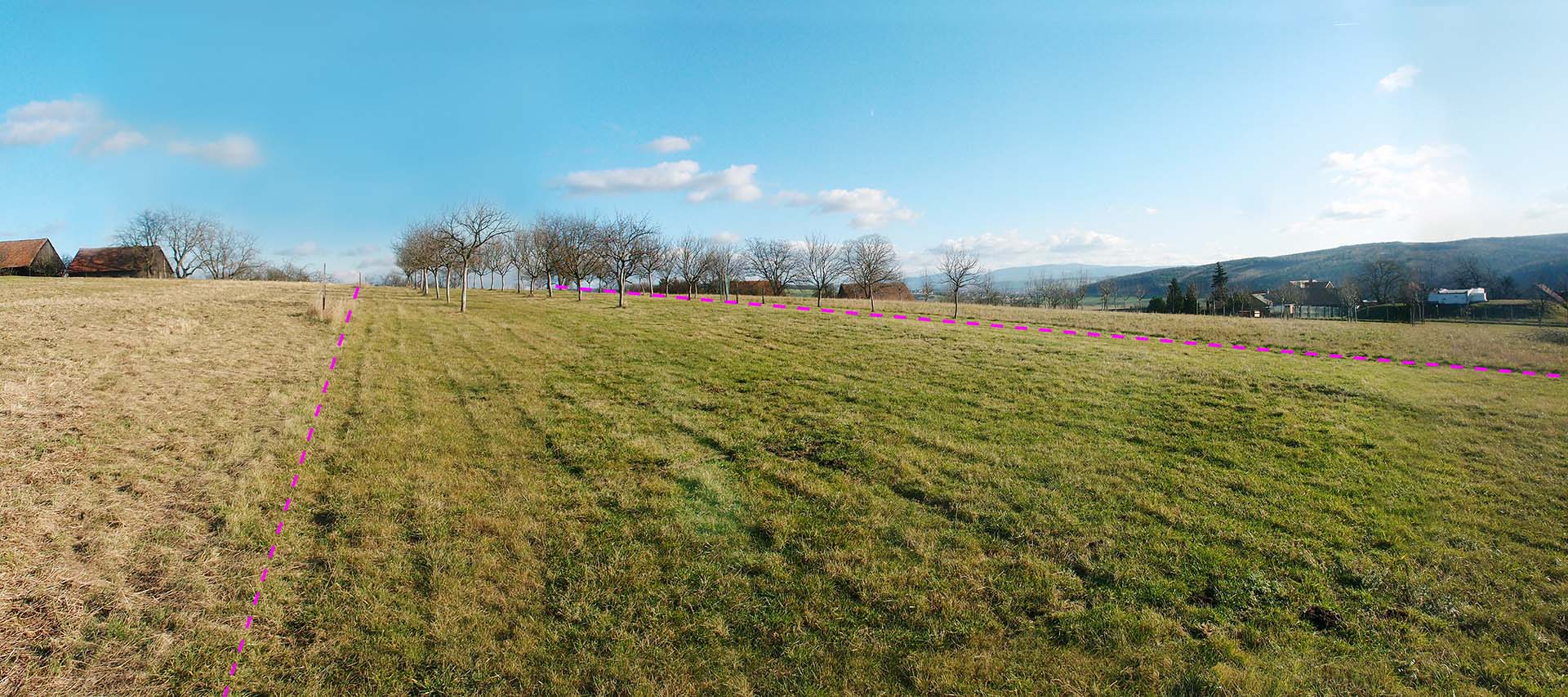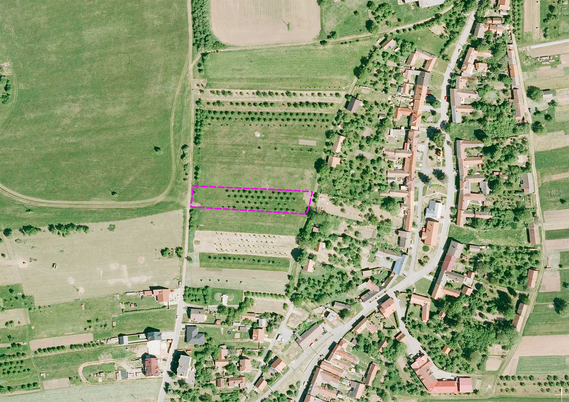 Podél východní hranice pozemku prochází záhumenní cesta, při západní hranici pozemek navazuje na polní cestu. Na pozemku je založen sad mladých ovocných stromků.