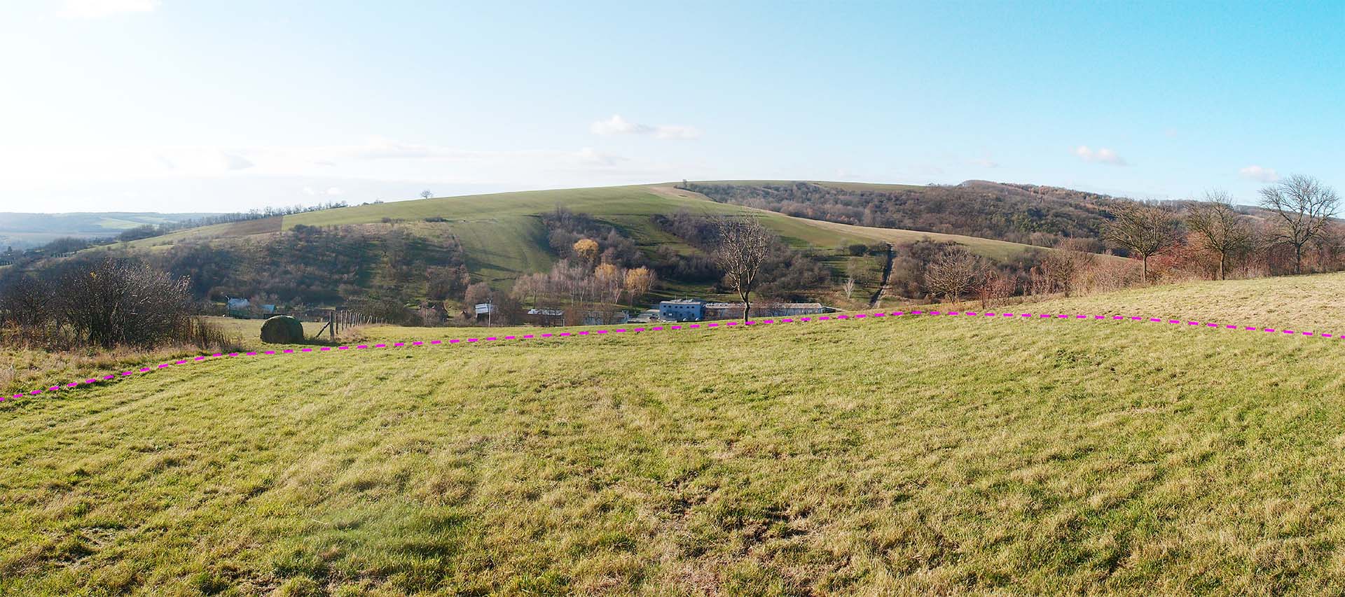 Relativně úzký pozemek vycházející z původní parcelace se svažuje ve dvou osách. V podélné ose se svažuje k západu, směrem k budoucí silnici, v příčném směru mírně klesá k jihu.