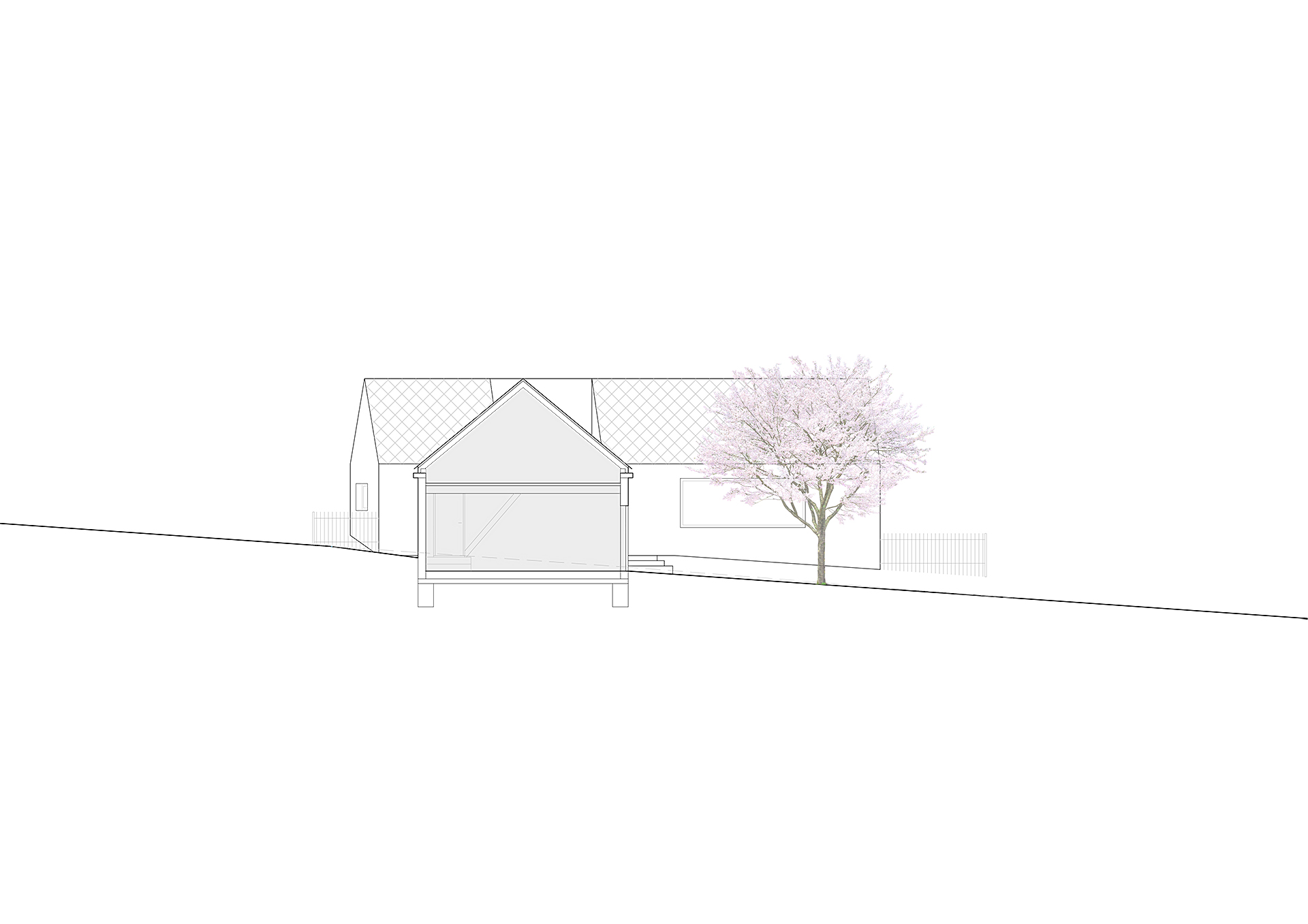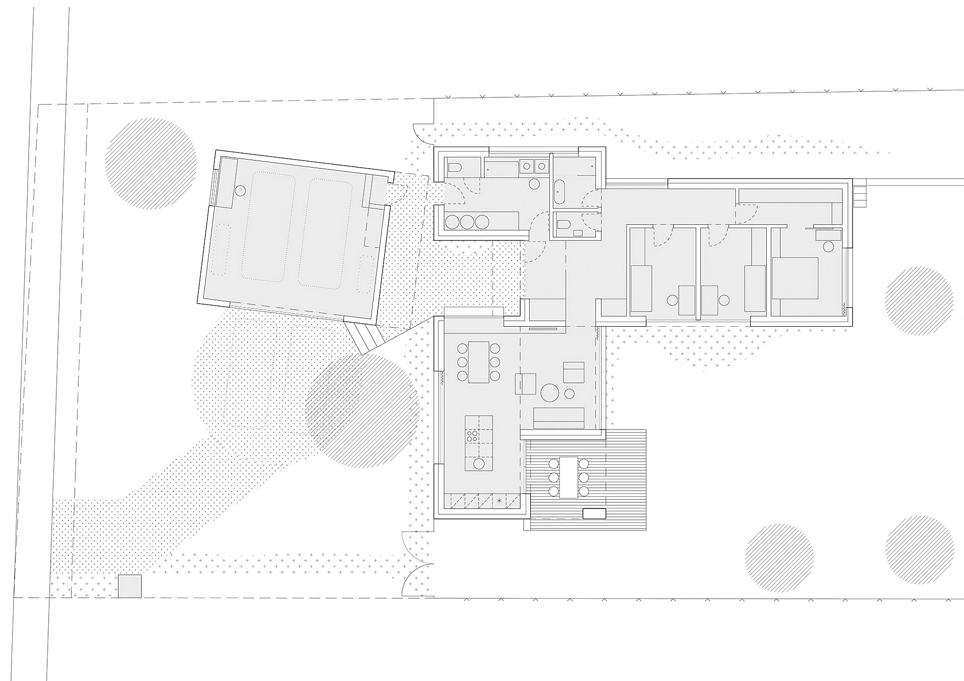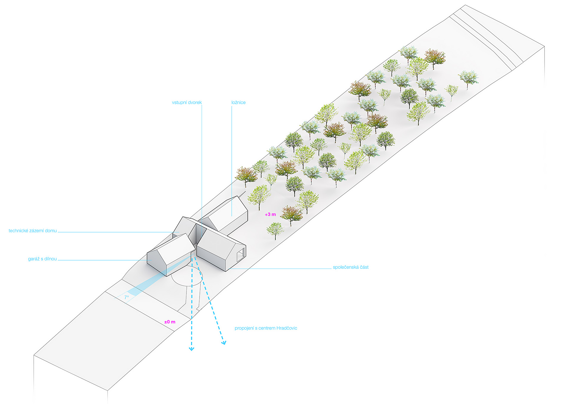 Níže položený objekt garáže kopíruje svažitost pozemku, objekt domu a garáže mezi sebou půdorysně formují závětrný vstupní dvorek a také vzájemnými vztahy vytvářejí na parcele prostory různé důležitosti a intenzity užívání. Garáž s dílnou je vzhledem k ortogonálnímu půdorysu domu natočena o 7° , rozevření dům symbolicky spojuje s centrem Hradčovic.