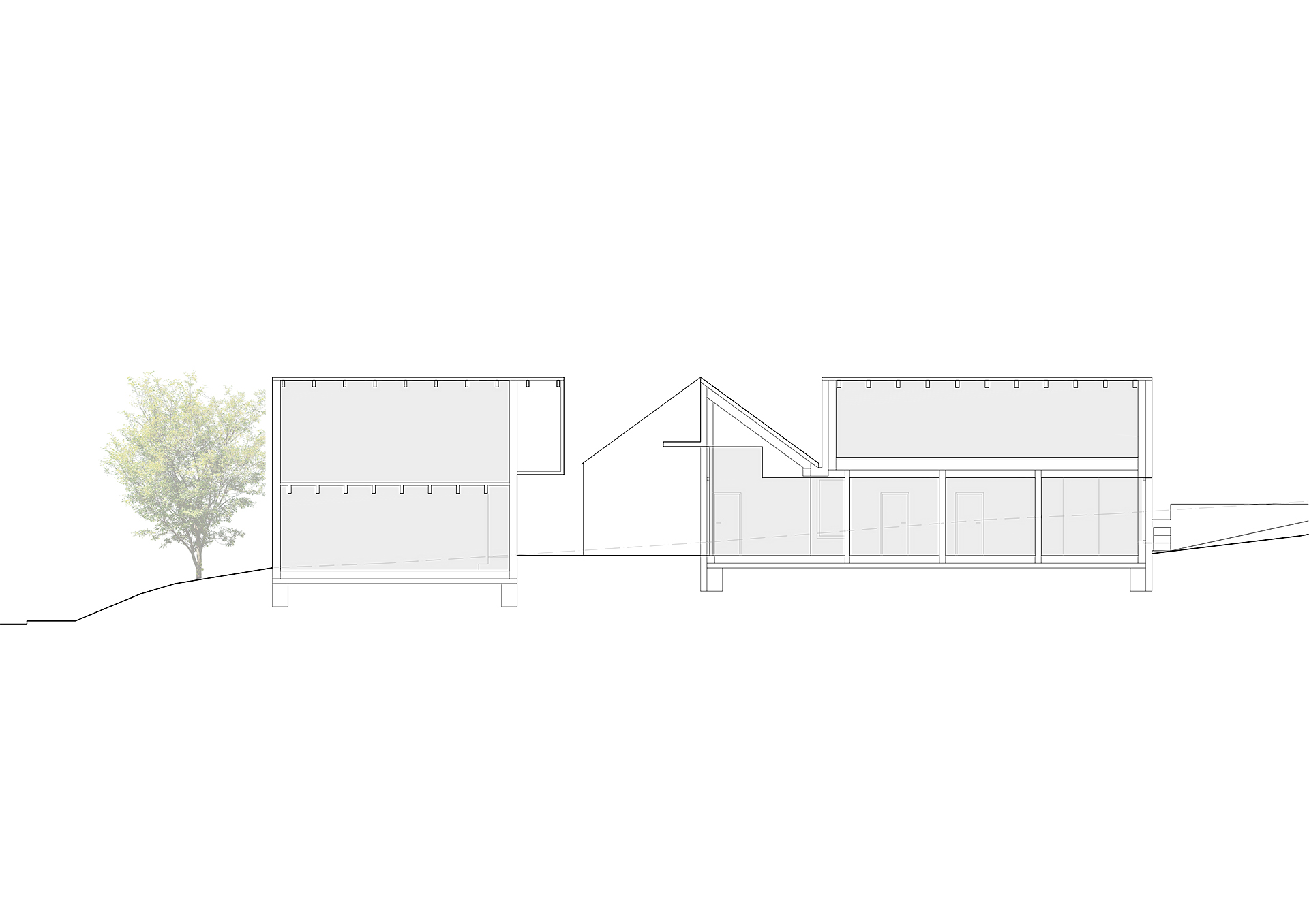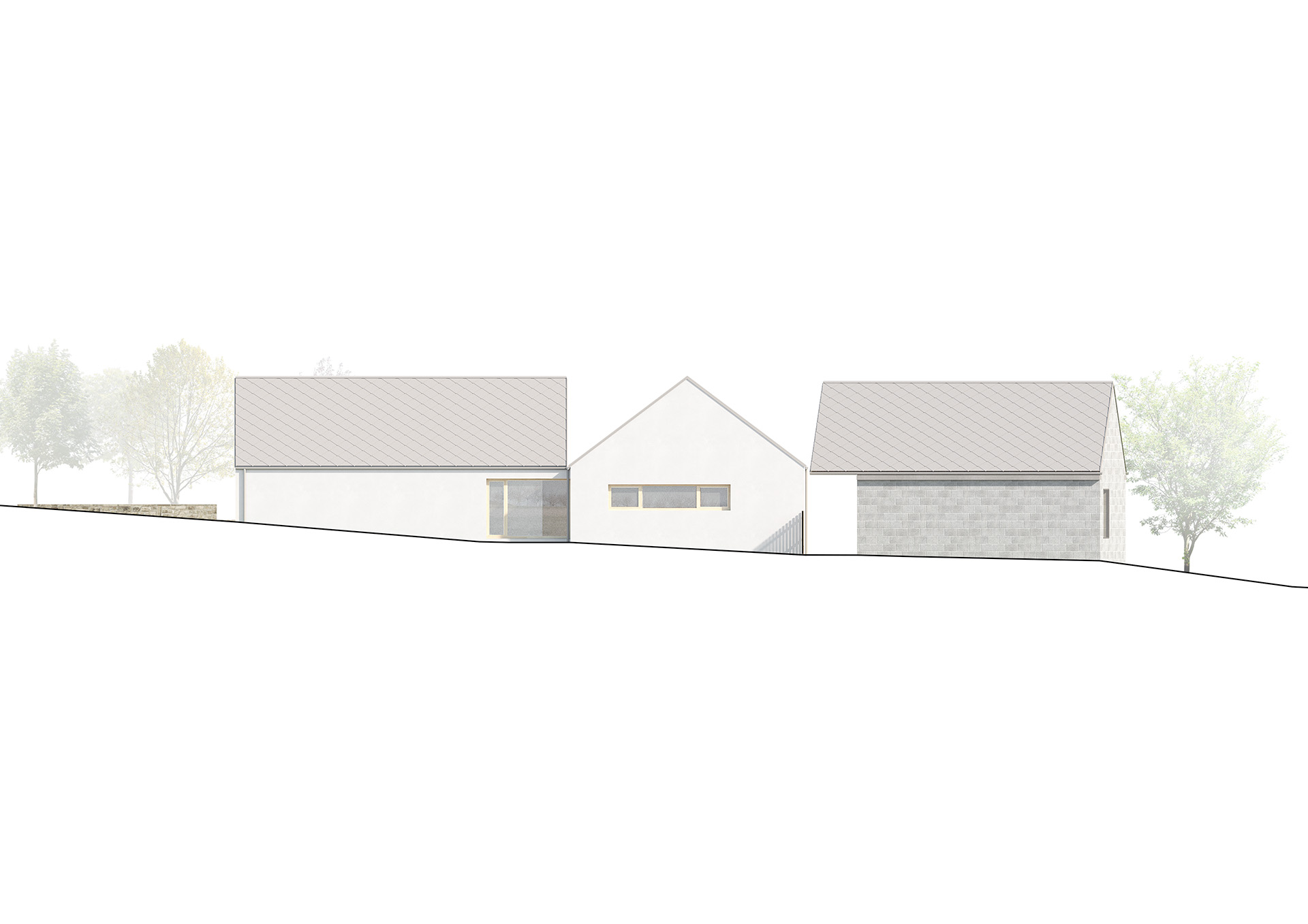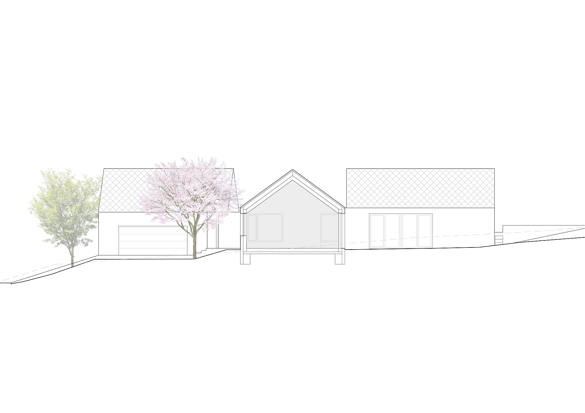 Níže položený objekt garáže kopíruje svažitost pozemku, objekt domu a garáže mezi sebou půdorysně formují závětrný vstupní dvorek a také vzájemnými vztahy vytvářejí na parcele prostory různé důležitosti a intenzity užívání. Garáž s dílnou je vzhledem k ortogonálnímu půdorysu domu natočena o 7° , rozevření dům symbolicky spojuje s centrem Hradčovic.