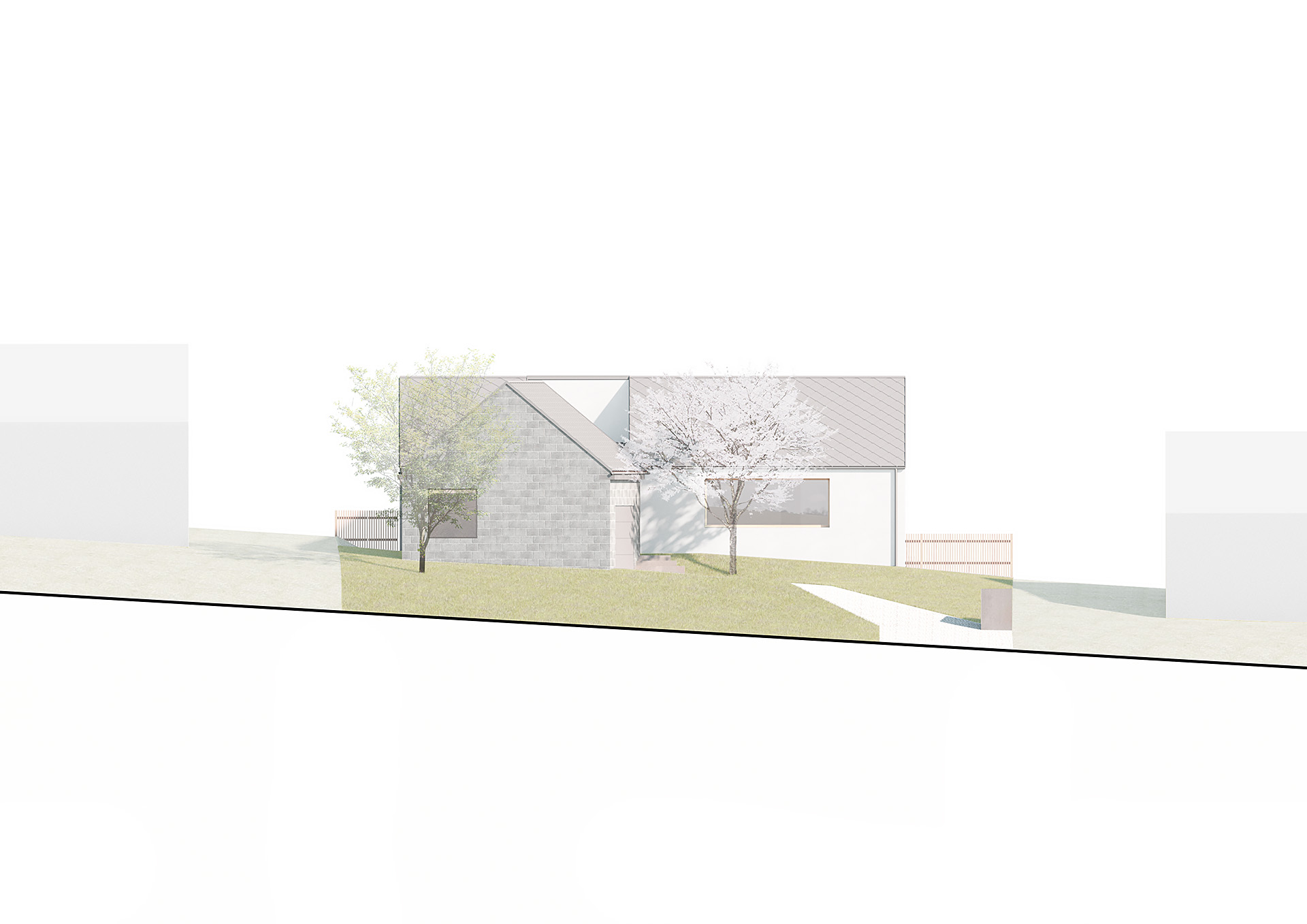 Hospodářské křídlo s garáží a objem obývaná části domu vymezují vstupní dvůr/předzahrádku – plácek pro příležitostné parkování. Průhledy z ulice do soukromé zahrady za domem jsou odstíněny plaňkovým plůtkem se vstupní brankou a bránou umožňující průjezd do prostoru sadu za domem.