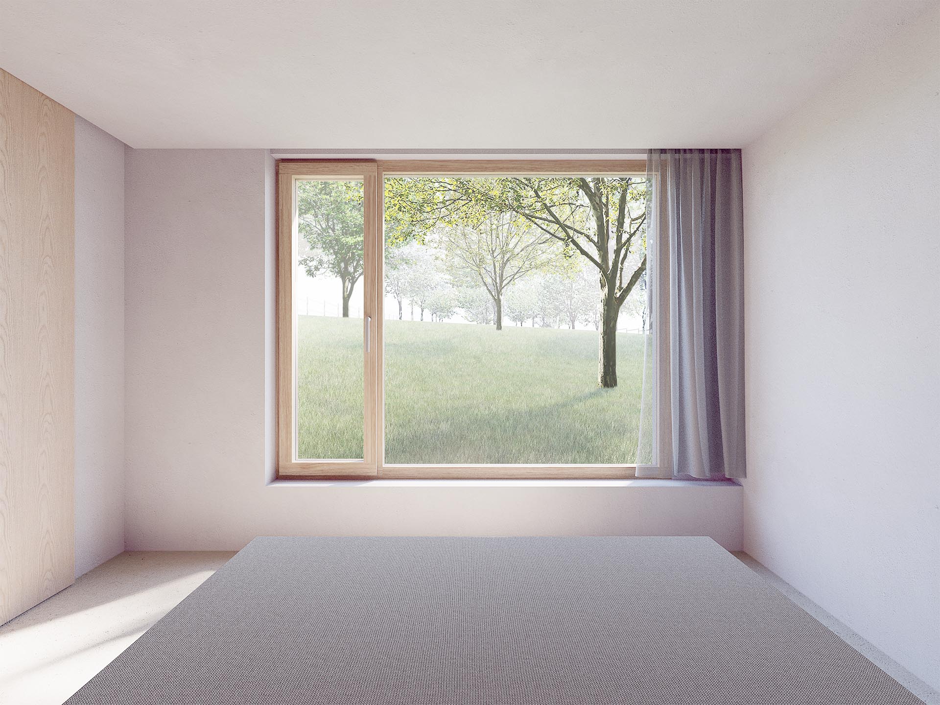 Zádveří s navazující halou je centrálním prostorem propojující chodbu k soukromým pokojům, koupelnu, toaletu a společenský prostor. Chodba k pokojům je prosvětlena oknem se sníženým parapetem. Pokoje dětí jsou orientovány na jih. Ložnice s oknem orientovaným na východ směrem do sadu je na společnou chodbu napojena přes šatnu. Na zádveří je napojena místnost pro domácí práce s možností umístit pračku, sušičku a další nezbytné technologie domu..