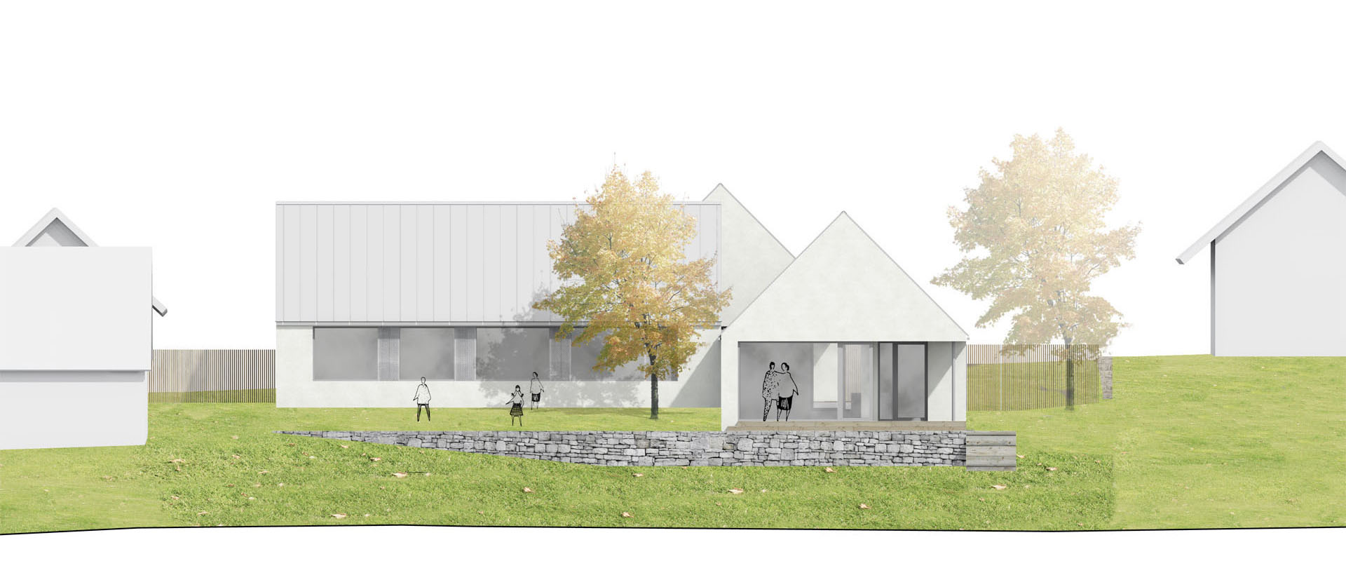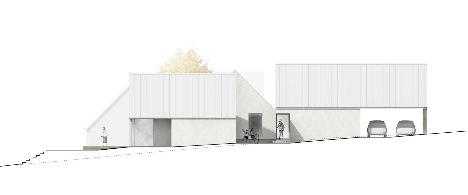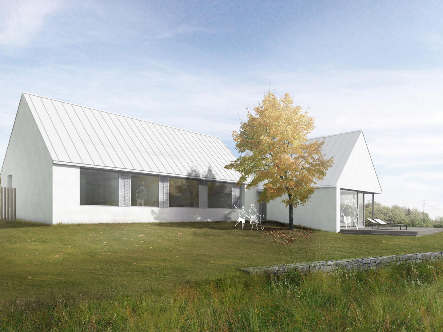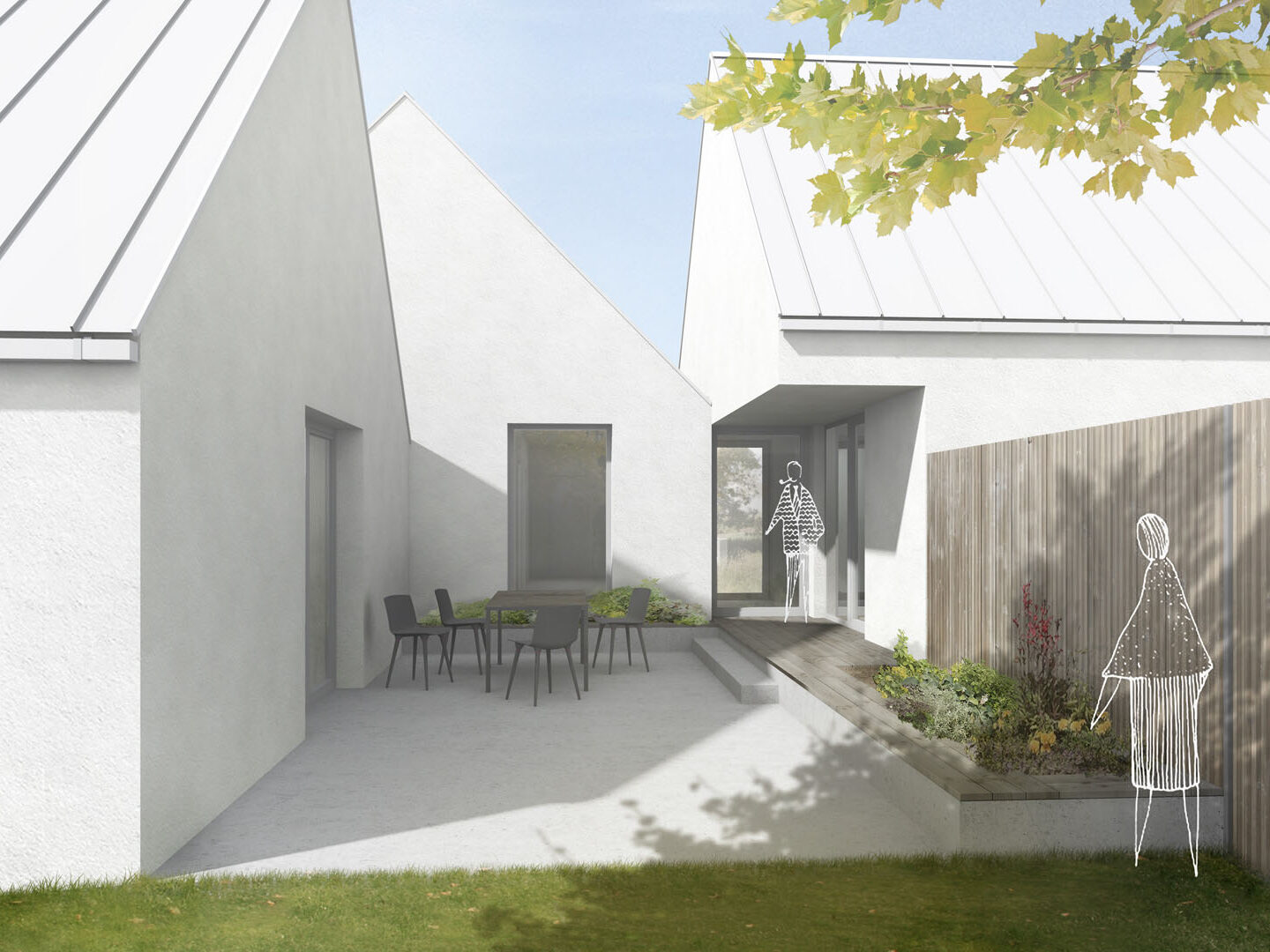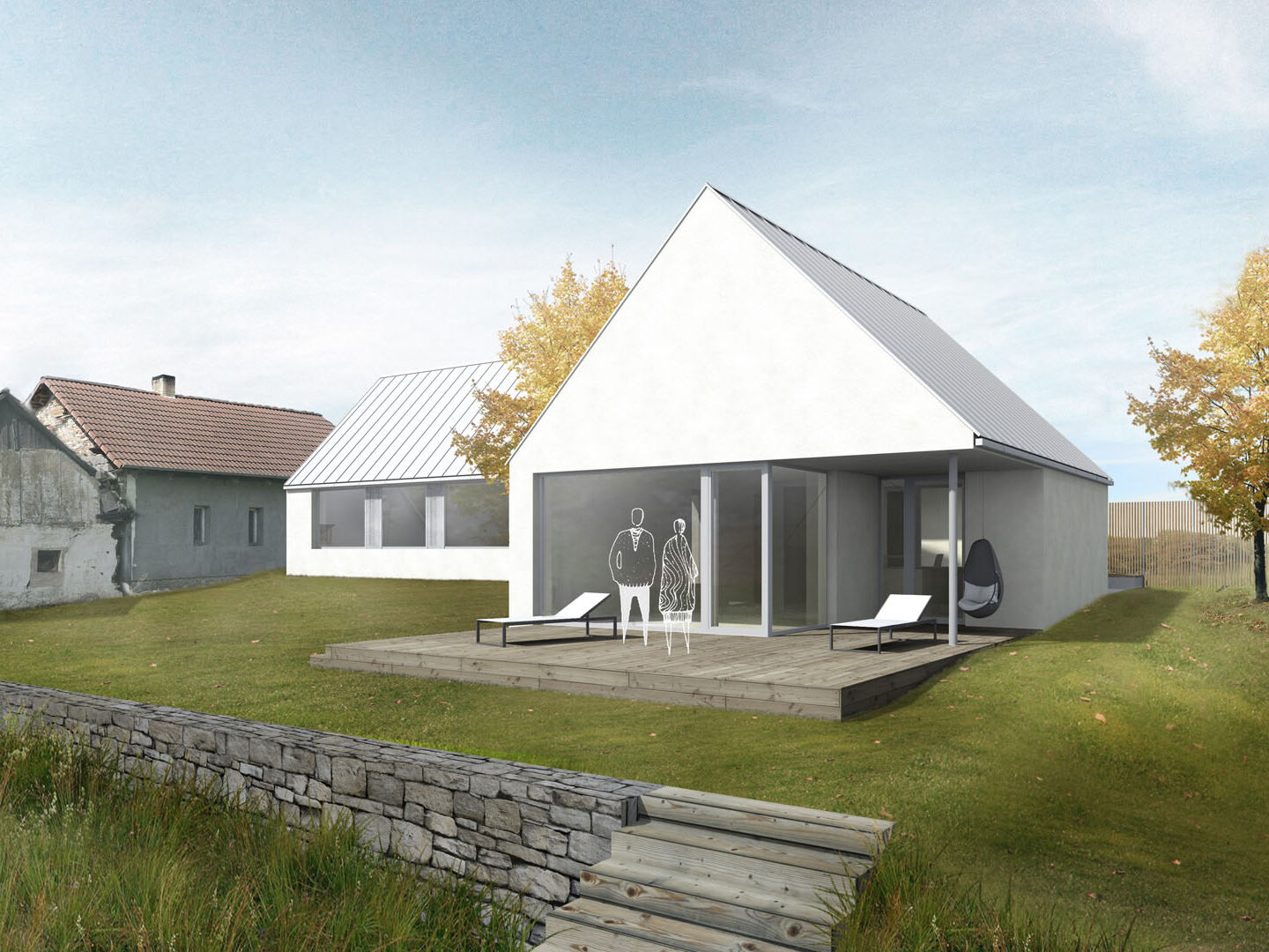 Jako odpověď na zadání a definovanou lokalitu navrhujeme dům – triptych. Objem je frázován do tří samostatných hmot se sedlovými střechami. Způsobem výškového rozmístění hmoty kopírují svažitost pozemku, půdorysně mezi sebou formují závětrný dvorek a také vzájemnými vztahy vytvářejí na parcele prostory různé důležitosti a intenzity užívání. Každá část domu objímá jeden ucelený funkční díl dispozice – hospodářské zázemí, klidovou část a nakonec společenský prostor – světnici.
