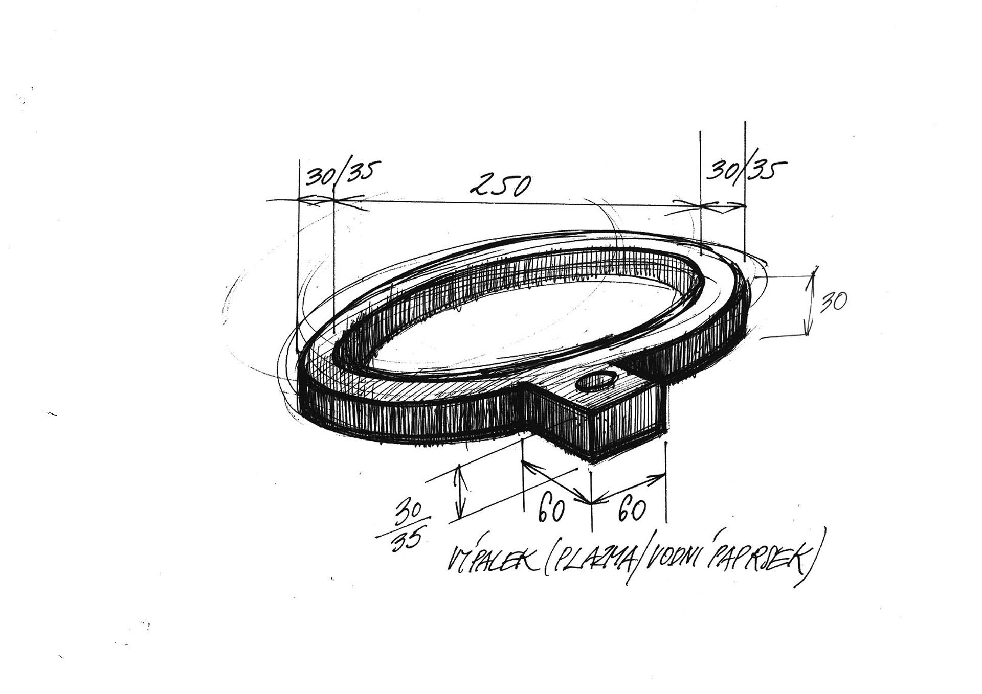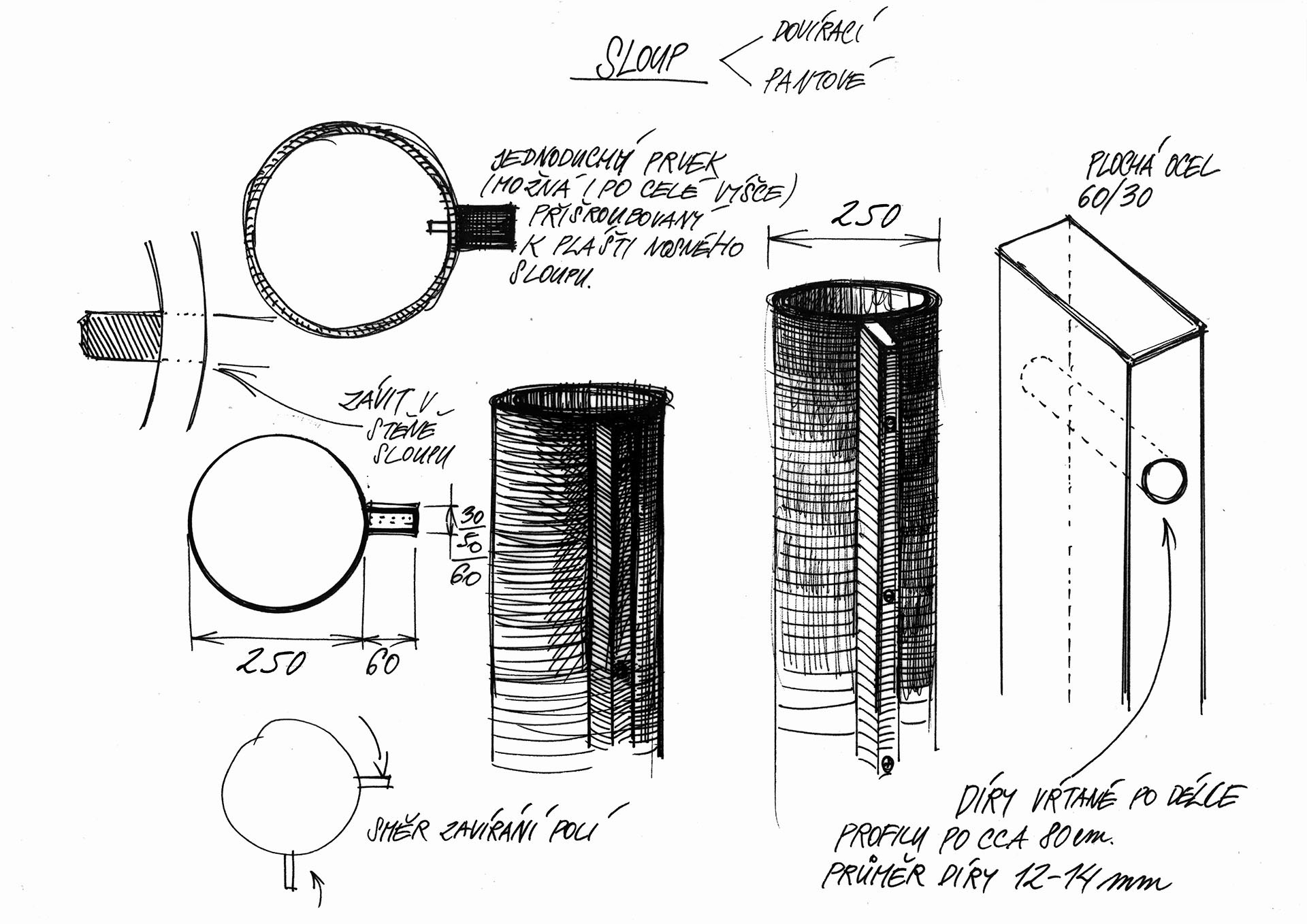 Bránu vnímáme především ve vztahu k symbolu vstupu, nikoli ve vazbě na opevnění či plot, který je branou narušen. Navrhujeme tak kolonádu jako součást veřejného prostoru. Do rastru sloupořadí vkládáme plotové pole, které umožňují vytvářet potřebné provozní vazby. Při zachování možnosti uzavření areálu lze definovat otevřený vztah mezi městem a areálem Výstaviště. Konkávní geometrie symbolizuje vstřícnost. Ocelová struktura je vystavena vzájemným vztahům mezi jednotlivými prvky samotnými a mezi konkrétním elementem a okolím.
